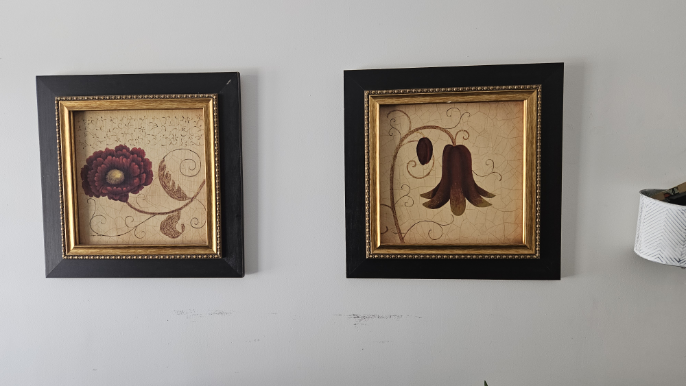 Set of two framed prints. Floral designs. Dark brown frames with gold inner accents. Cream coloured background. Perfect for adding a touch of elegance to your home.