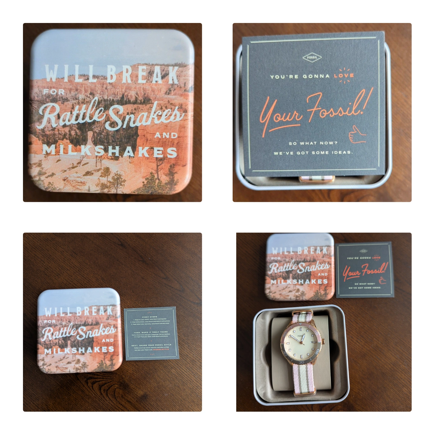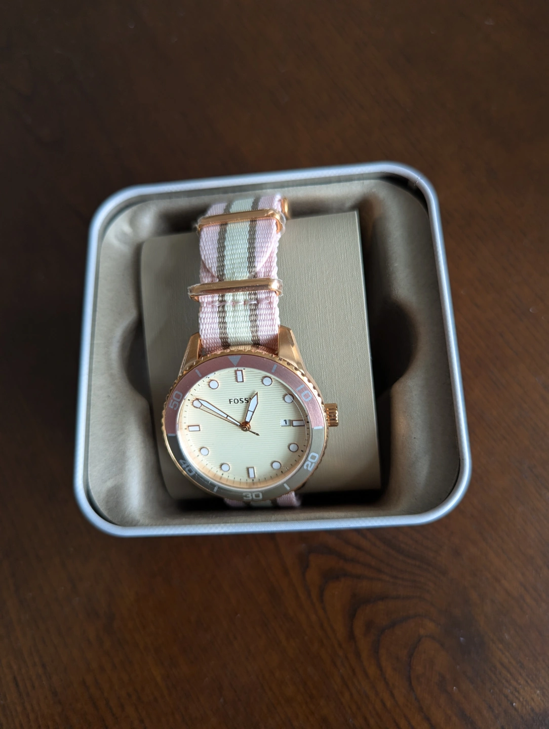 Pink and beige striped Nato strap. Comes in a collectible tin.