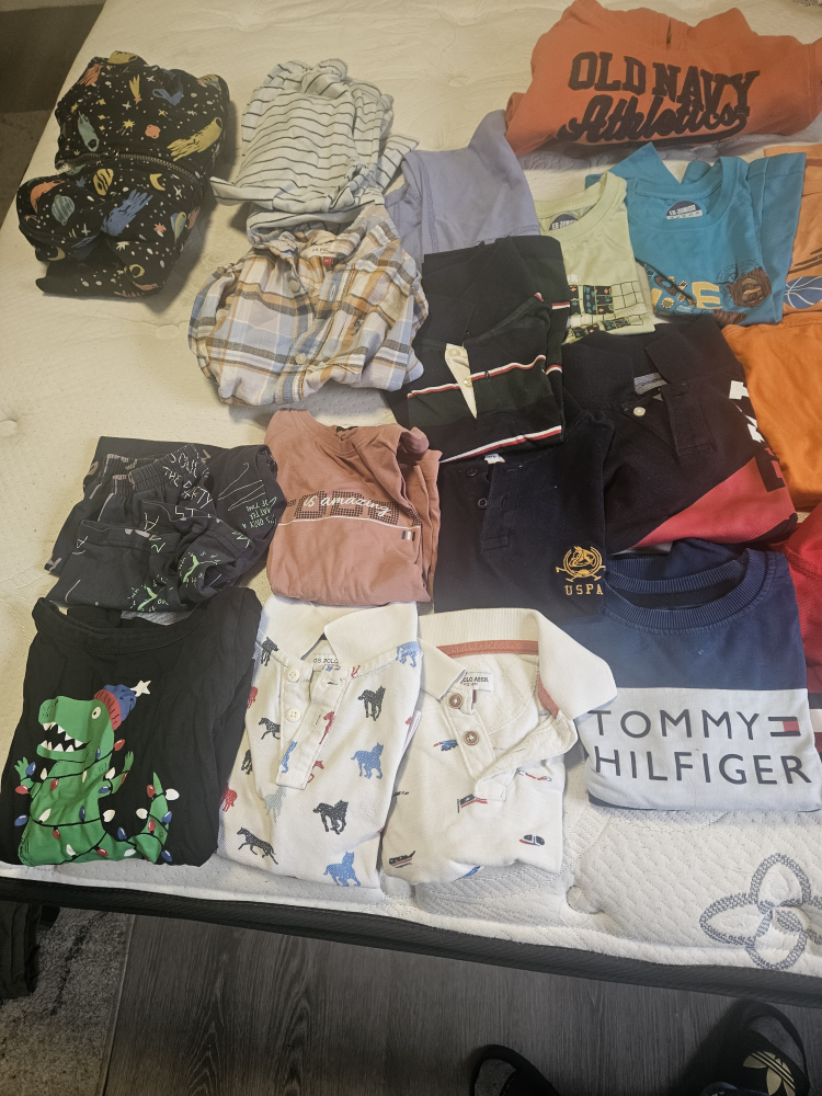 Large bundle of boys' clothing. Includes shirts, pants, and a suit. Various brands included. Great for everyday wear or special occasions. Sizes approximately 4T-5T.