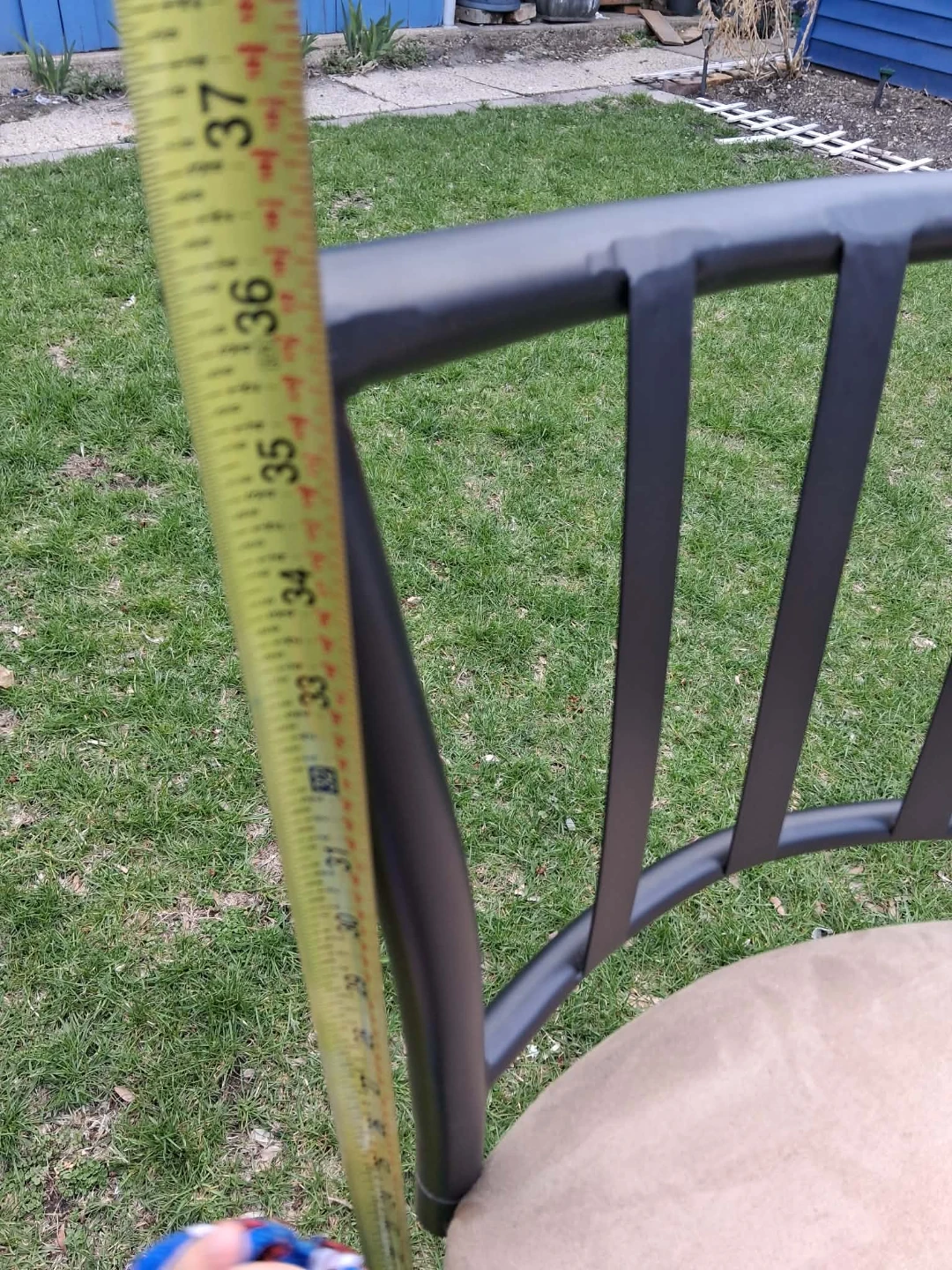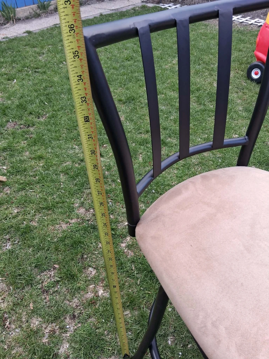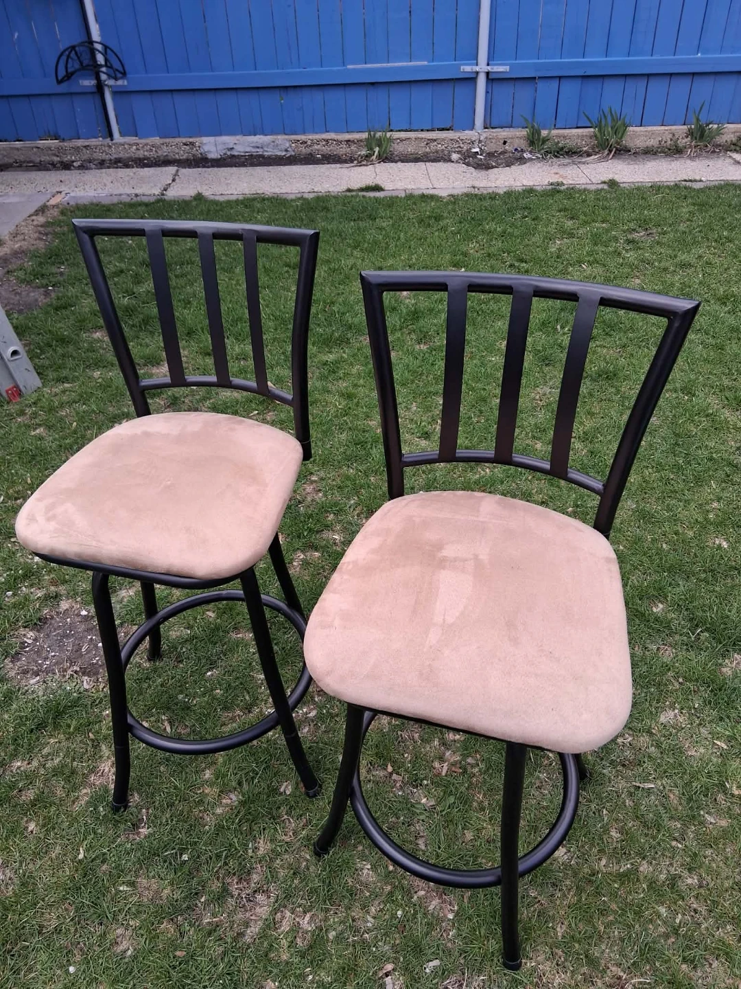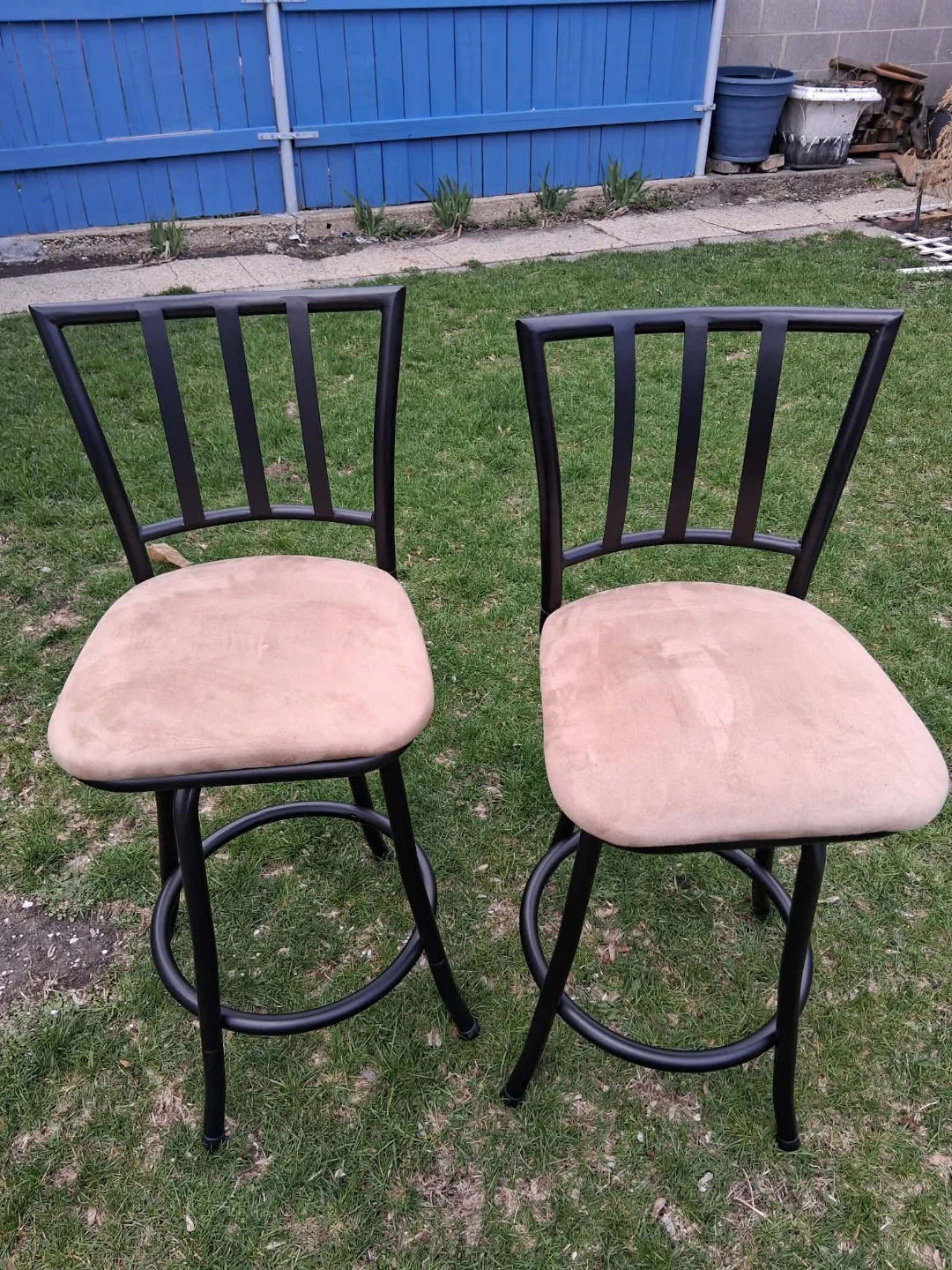 Two bar stools with tan upholstered seats and black metal frames. The seat height measures approximately 33 inches. They're perfect for a home bar or kitchen island.