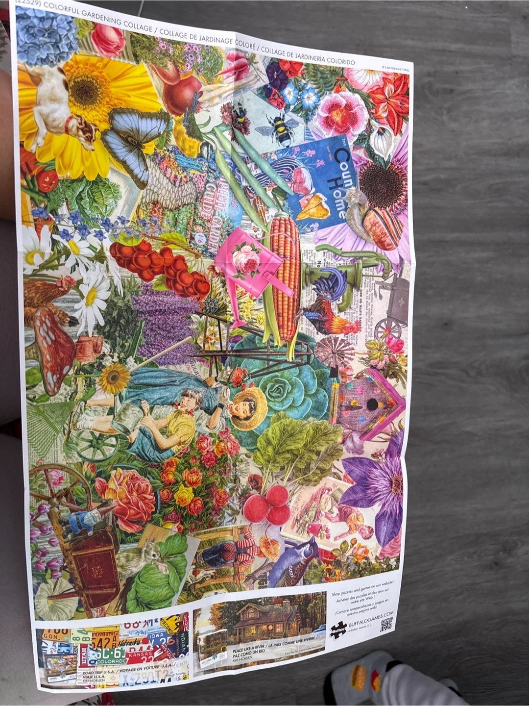 This Buffalo Games jigsaw puzzle features the "Colorful Gardening Collage" image by Lars Stewart. It includes 300 large pieces for easier handling. The puzzle is made with recycled paperboard and uses non-toxic, biodegradable glue.