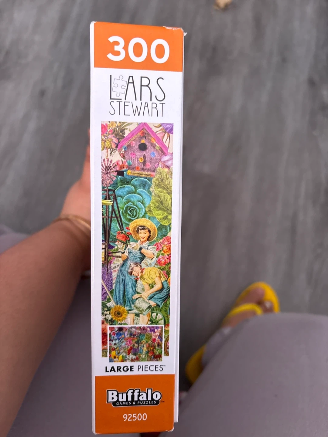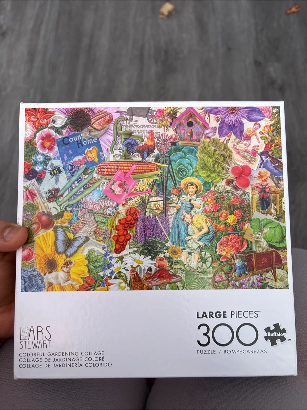 This Buffalo Games jigsaw puzzle features the "Colorful Gardening Collage" image by Lars Stewart. It includes 300 large pieces for easier handling. The puzzle is made with recycled paperboard and uses non-toxic, biodegradable glue.