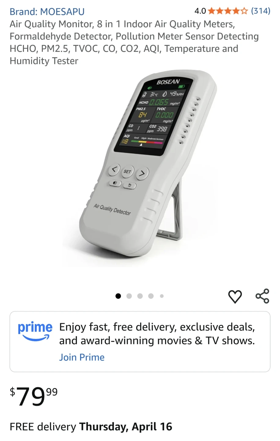 This is a Bosean Air Quality Detector. It measures HCHO, TVOC, CO, CO2, AQI, temperature, and humidity. Includes original packaging.