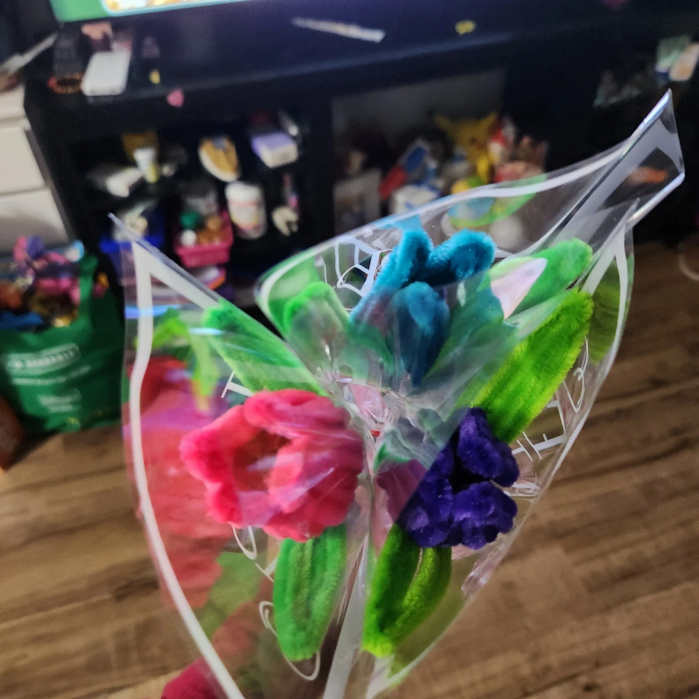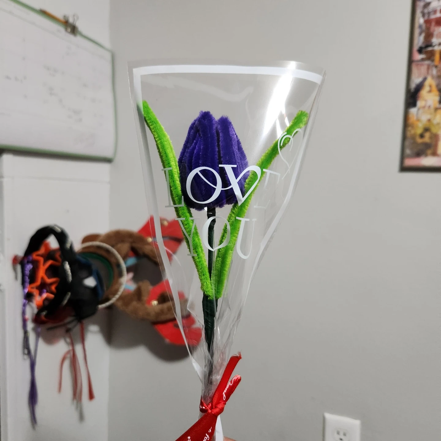 Selling adorable handmade pipe cleaner tulip flowers! They come in a variety of colours, including blue, purple, and pink. Perfect for adding a touch of whimsy to any space