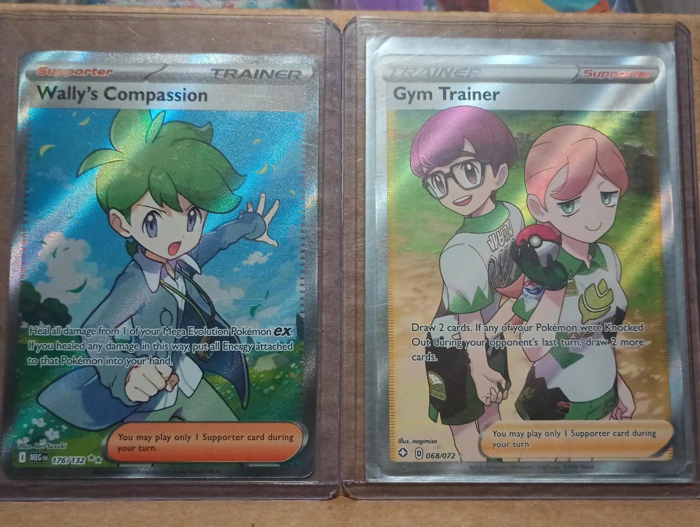 These are two Pokemon trainer cards: Wally's Compassion and Gym Trainer. Wally's Compassion allows you to heal all damage from one of your Mega Evolution Pokemon ex. Gym Trainer lets you draw 2 cards, and if any of your Pokemon were Knocked Out on your opponent's last turn, draw 2 more cards. You may play only one Supporter card during your turn.