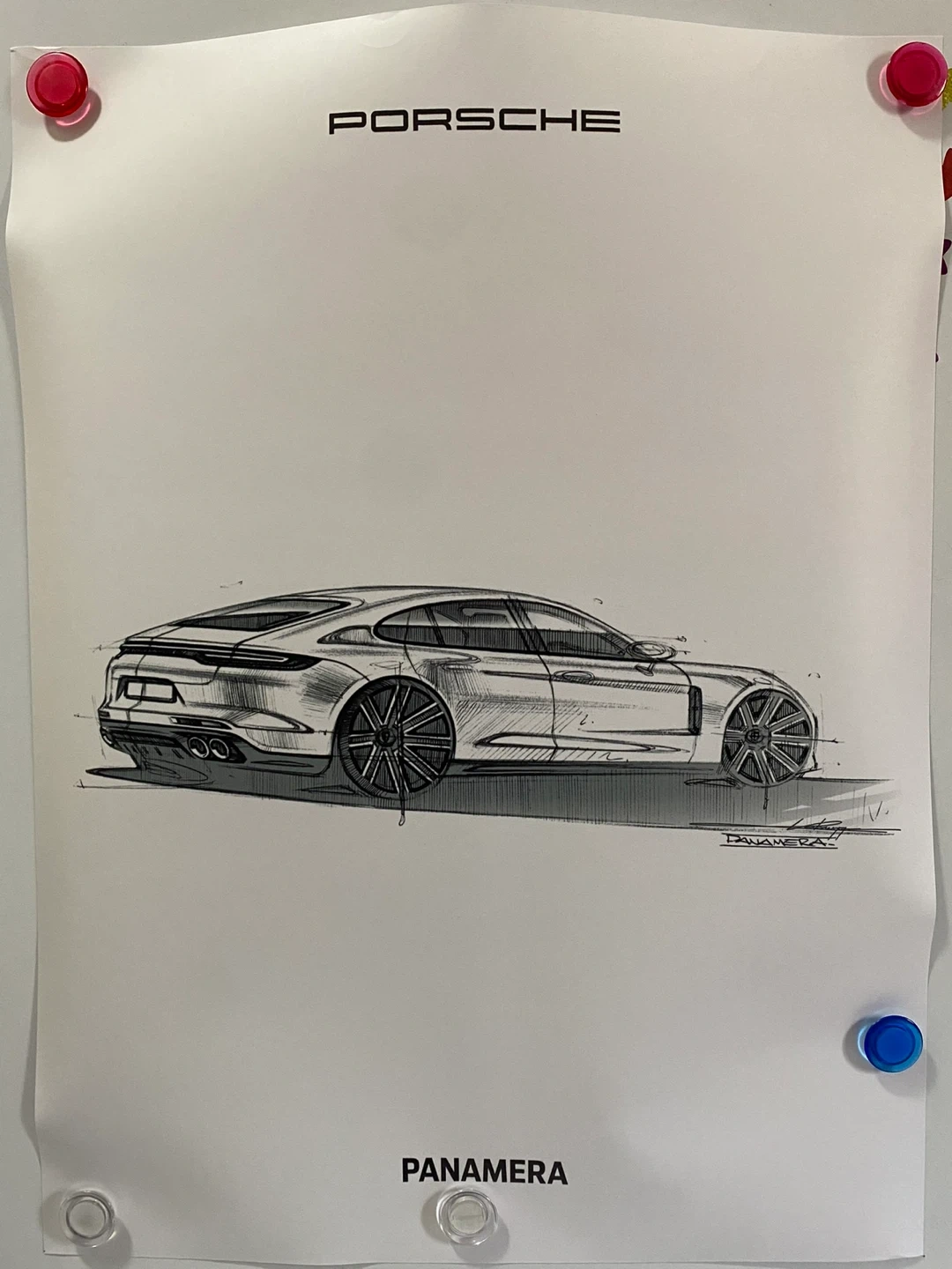 A technical sketch of a Porsche Panamera. The Panamera is a luxury four-door sports sedan produced by the German automobile manufacturer Porsche.