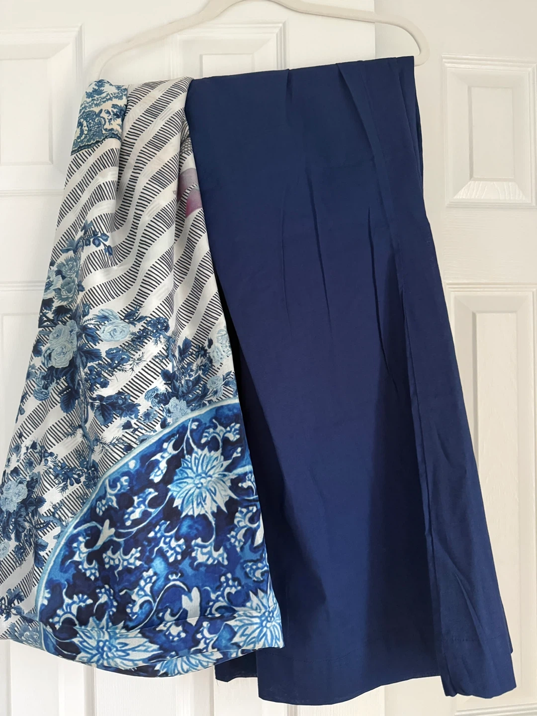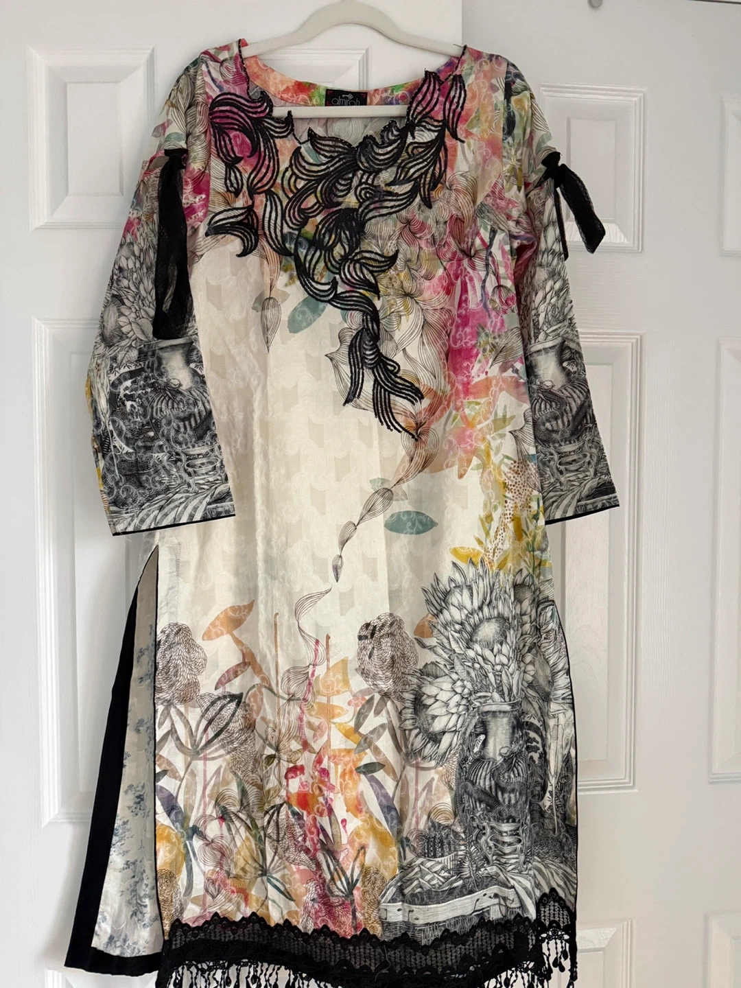 Beautifully printed 3-piece Pakistani suit. The kurti has intricate black lace detailing and a vibrant floral and monochrome print. It's paired with solid navy blue pants and a matching printed dupatta. Perfect for cultural events or festive occasions! Chest size 21!
