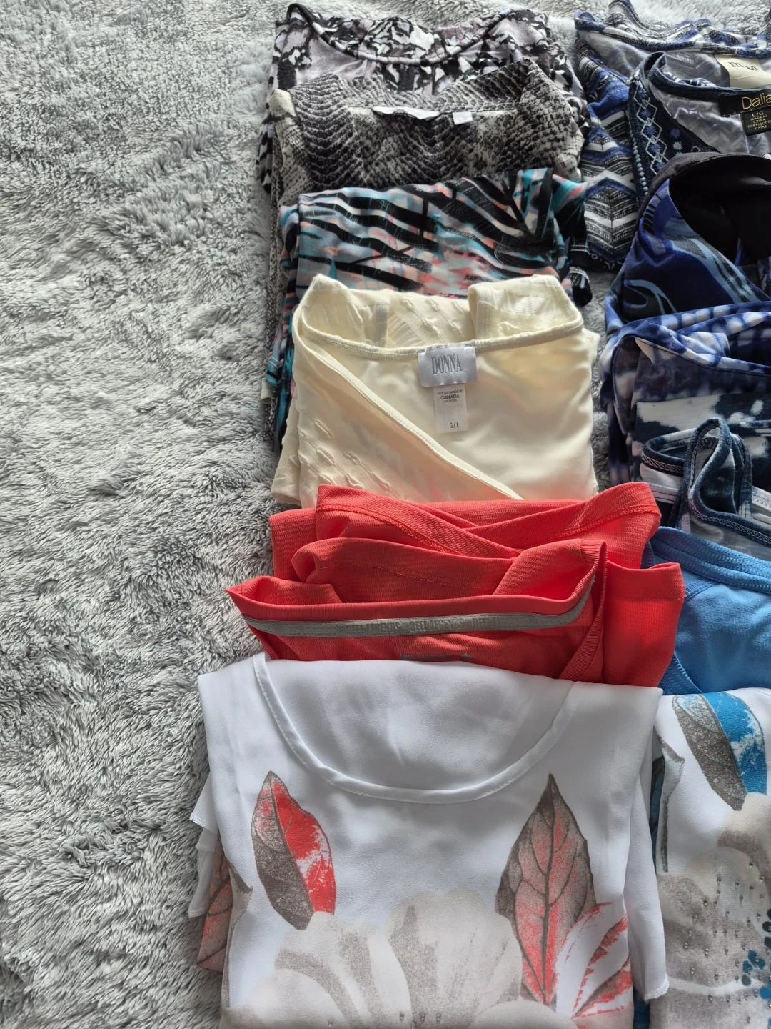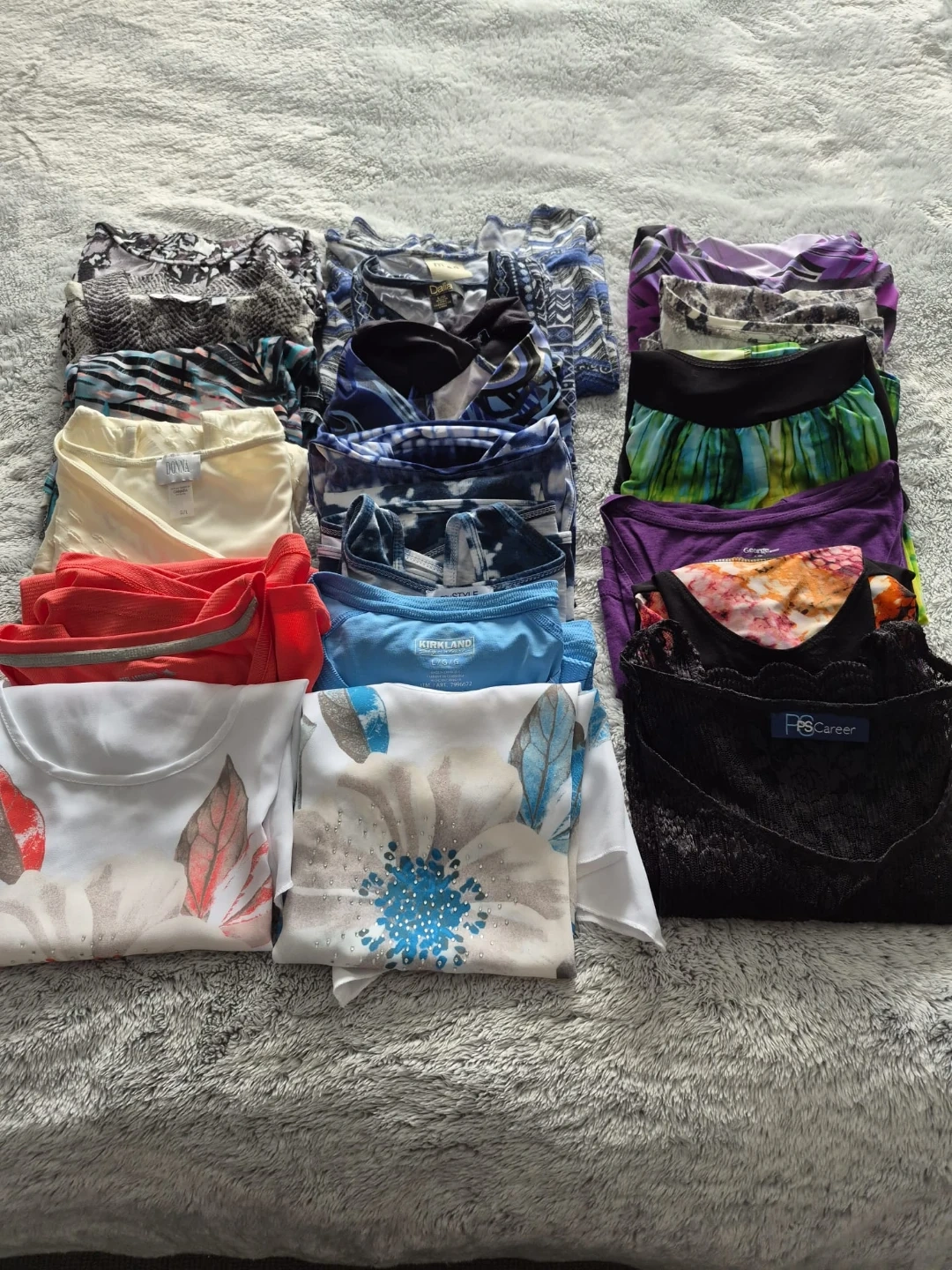 This lot includes 19 women's tops and tank tops in various styles and prints. Brands visible include Donna, Kirkland, George, and P/R Career. These tops offer a mix of casual and dressy options for everyday wear.