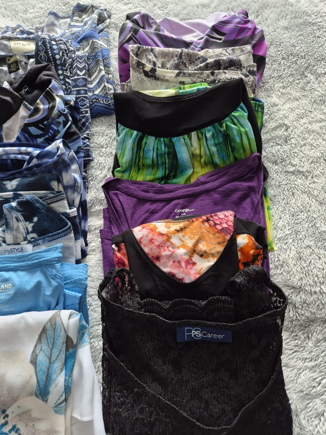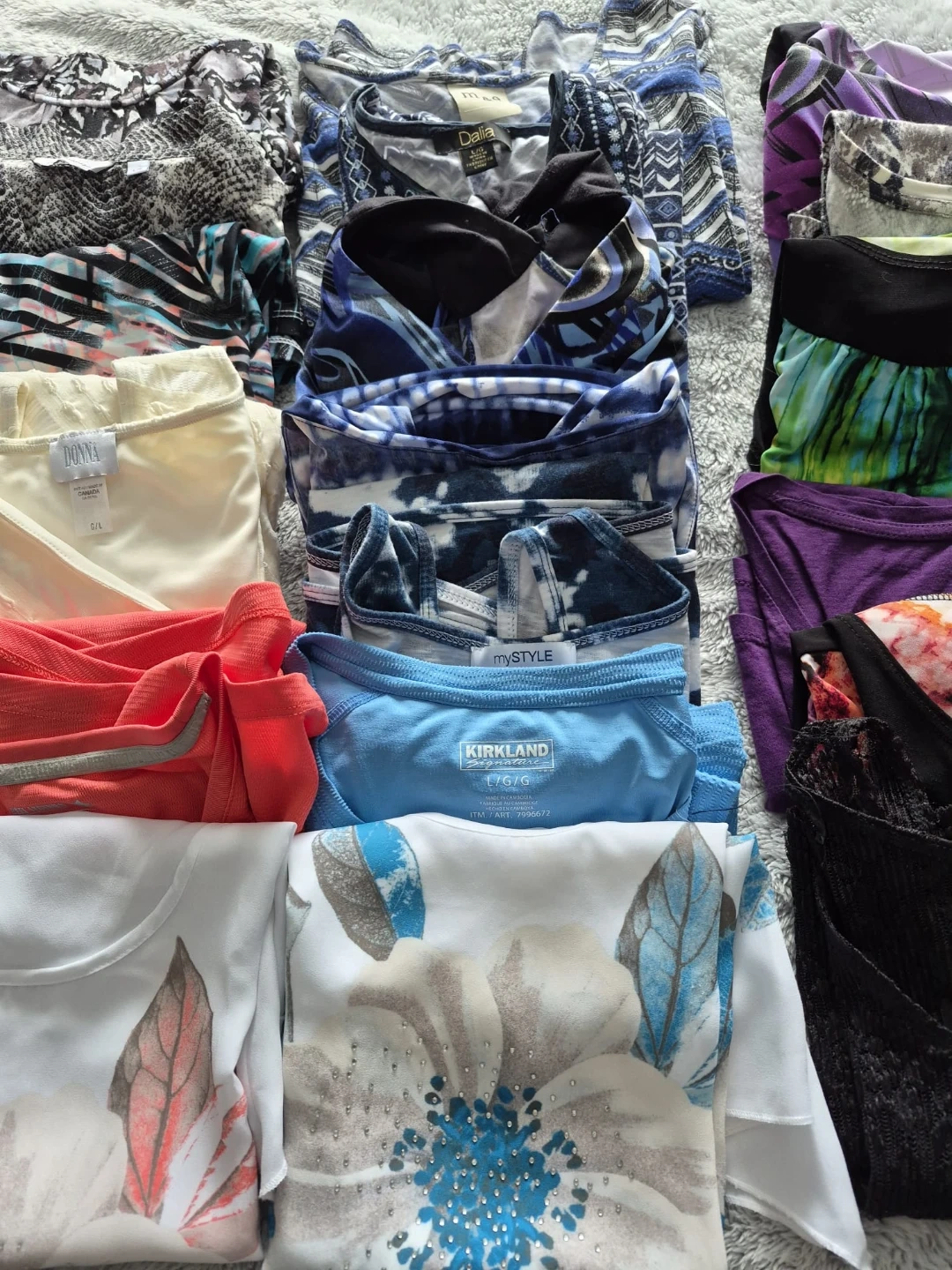 This lot includes 19 women's tops and tank tops in various styles and prints. Brands visible include Donna, Kirkland, George, and P/R Career. These tops offer a mix of casual and dressy options for everyday wear.