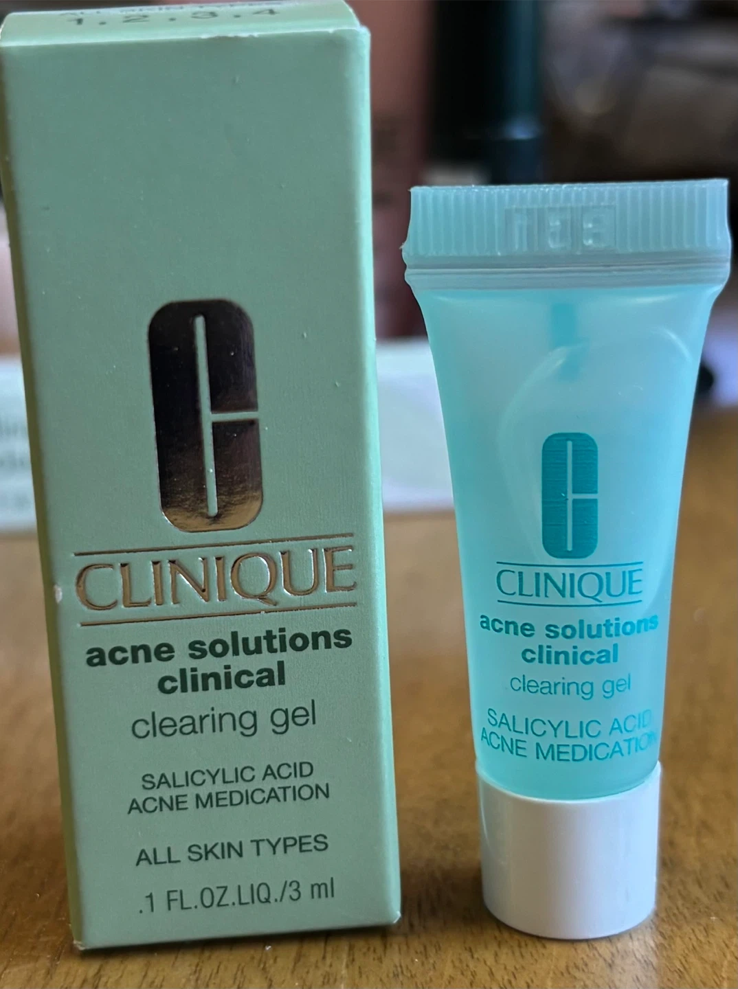 Clinique Acne Solutions Clinical Clearing Gel. Contains salicylic acid acne medication. For all skin types. 0.1 fl. oz. liq. / 3 ml.