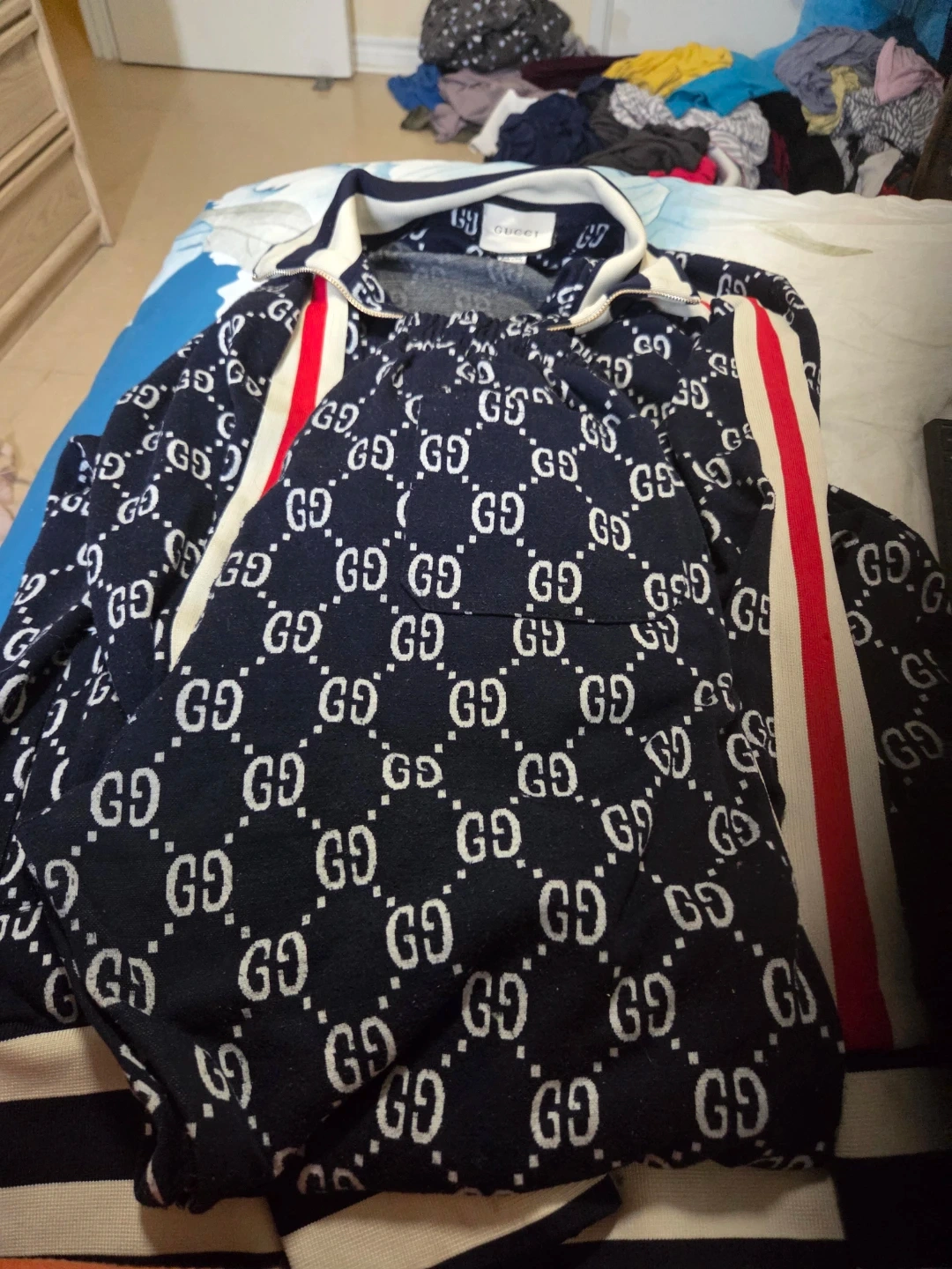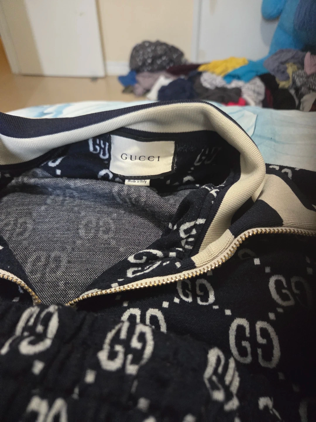 This is a Gucci zip-up jacket featuring the all-over GG monogram print. It's made in Italy with a classic collar and stripe detailing on the sleeves. It's a stylish piece for your wardrobe.