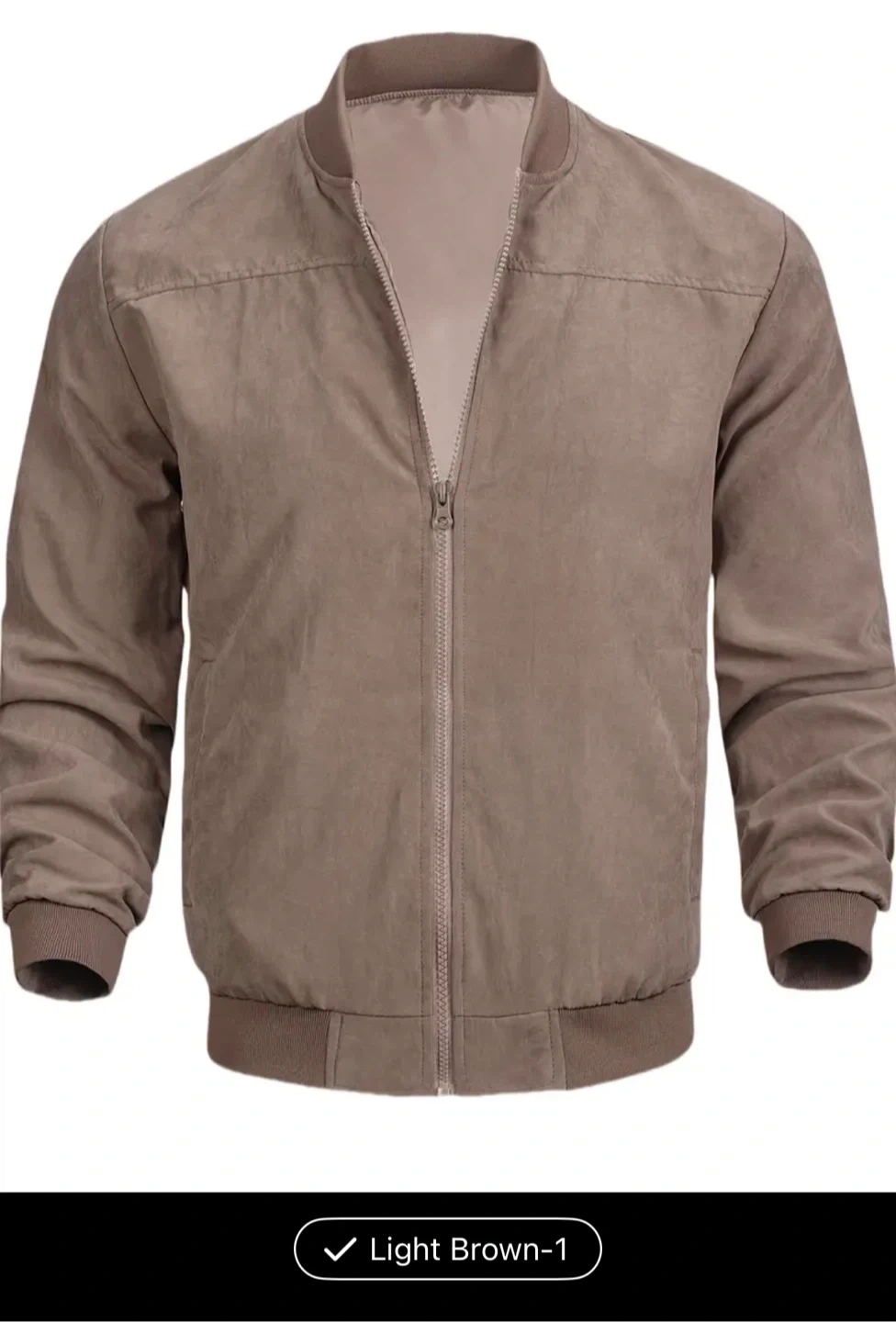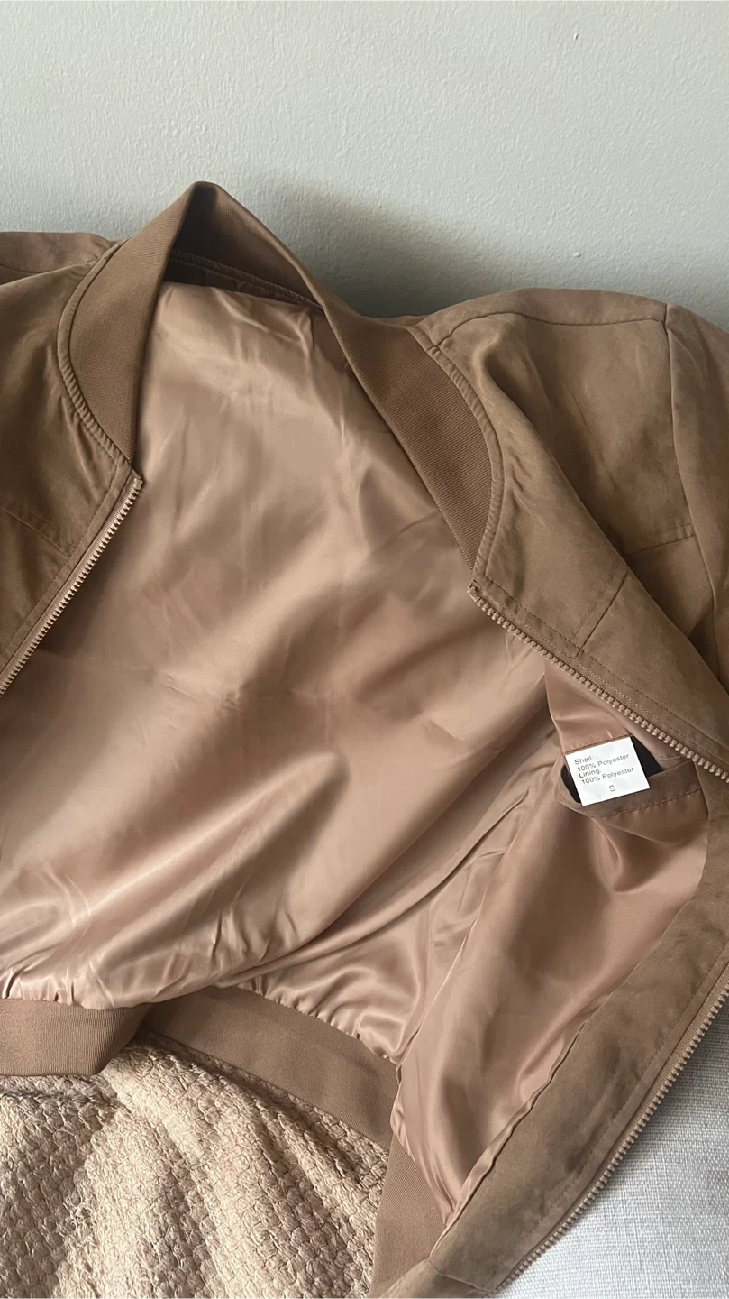 This light brown bomber jacket features a smooth satin lining and a faux suede outer shell. It's a stylish choice for everyday wear. The jacket includes ribbed cuffs and hem for a snug fit. It's made with 100% polyester.