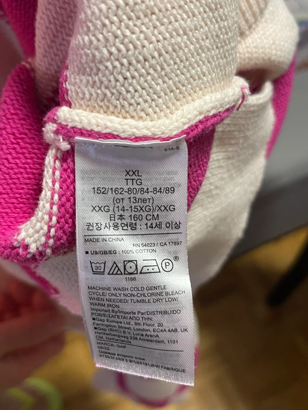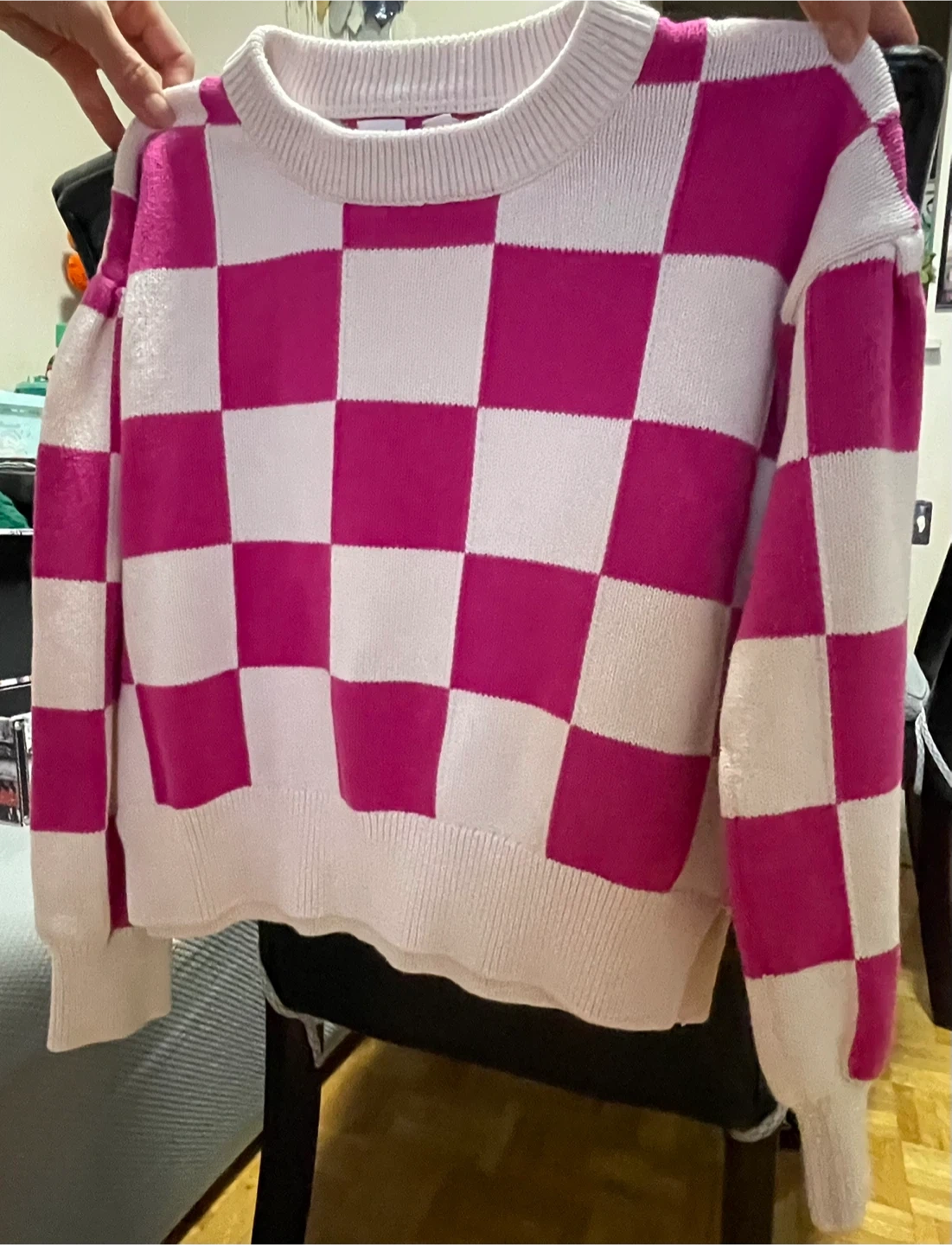 This Gap sweater is in size XXL and made of 100% cotton. It features a bold pink and white checkered pattern. A cozy knit perfect for cooler days!