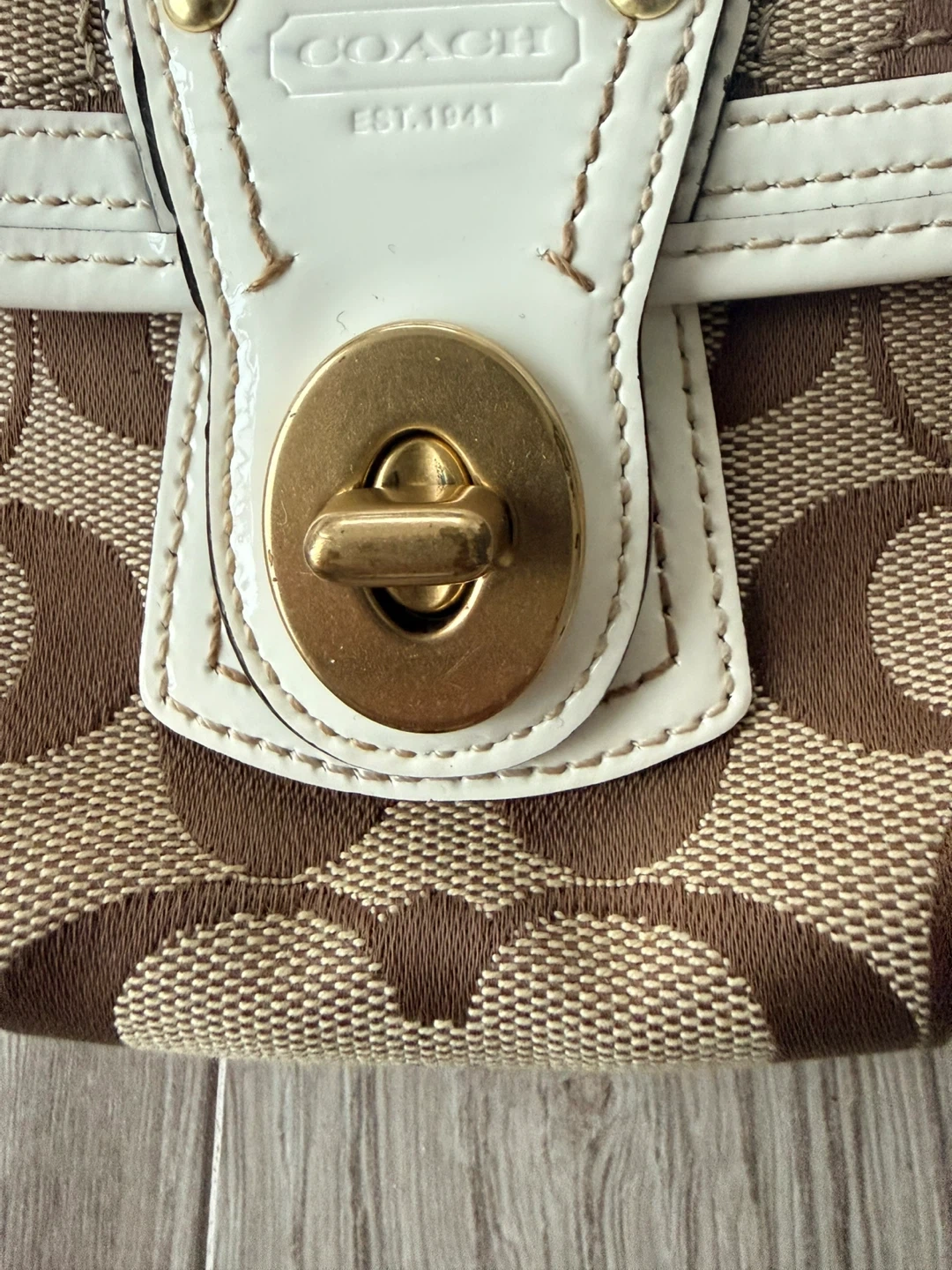 This is a cute Coach wristlet with the signature canvas pattern in brown and white. It's perfect for carrying your essentials when you don't want to lug around a big bag! The gold hardware adds a touch of elegance. It's in great condition.