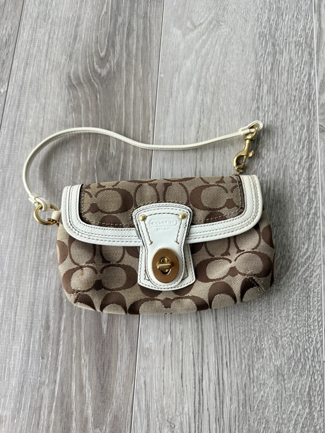 This is a cute Coach wristlet with the signature canvas pattern in brown and white. It's perfect for carrying your essentials when you don't want to lug around a big bag! The gold hardware adds a touch of elegance. It's in great condition.