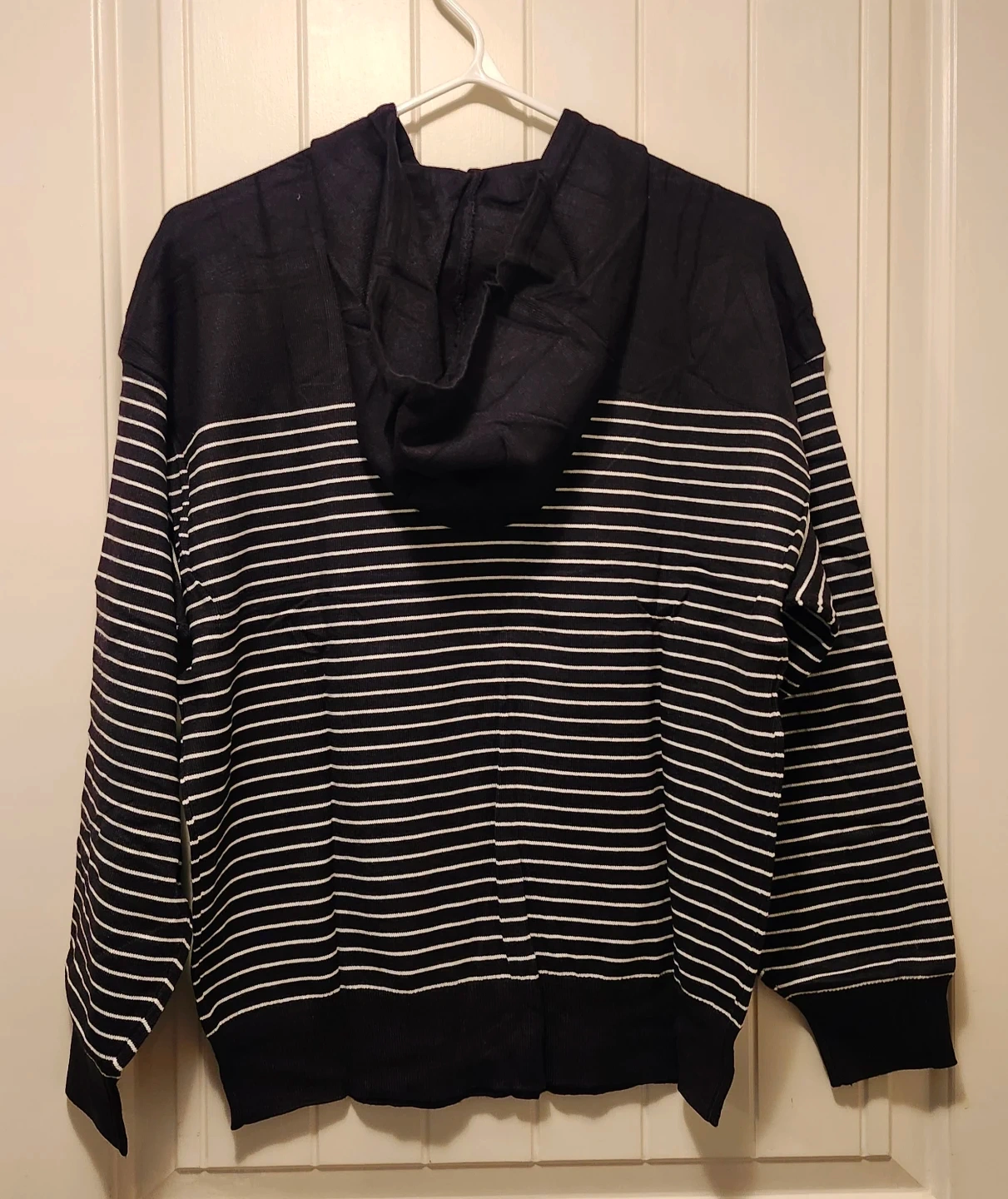 This is a MEROKEETY women's hooded sweatshirt. It's a size small and features a navy blue and white striped pattern. The hoodie has drawstrings and a comfortable knit design.