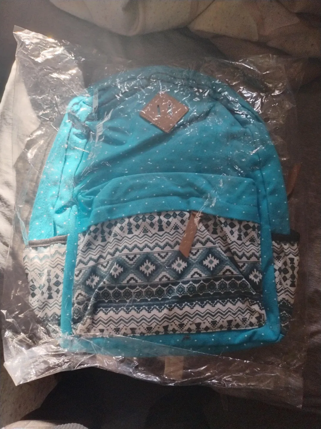 Selling a brand new, still-in-package blue backpack! It features a cute polka dot pattern on the top and a unique geometric design on the front pocket. Perfect for school, travel, or everyday use!