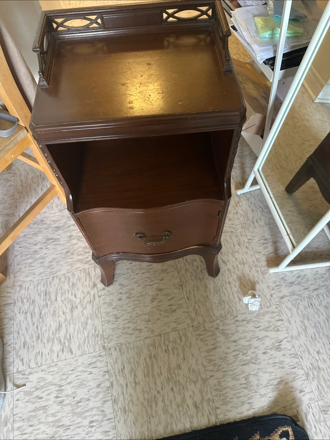 Dark brown wooden end table. Features a single drawer and open shelf. Intricate detailing on the top and sides. Curved legs. Shows some wear.
