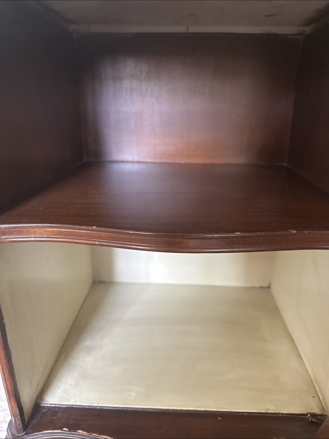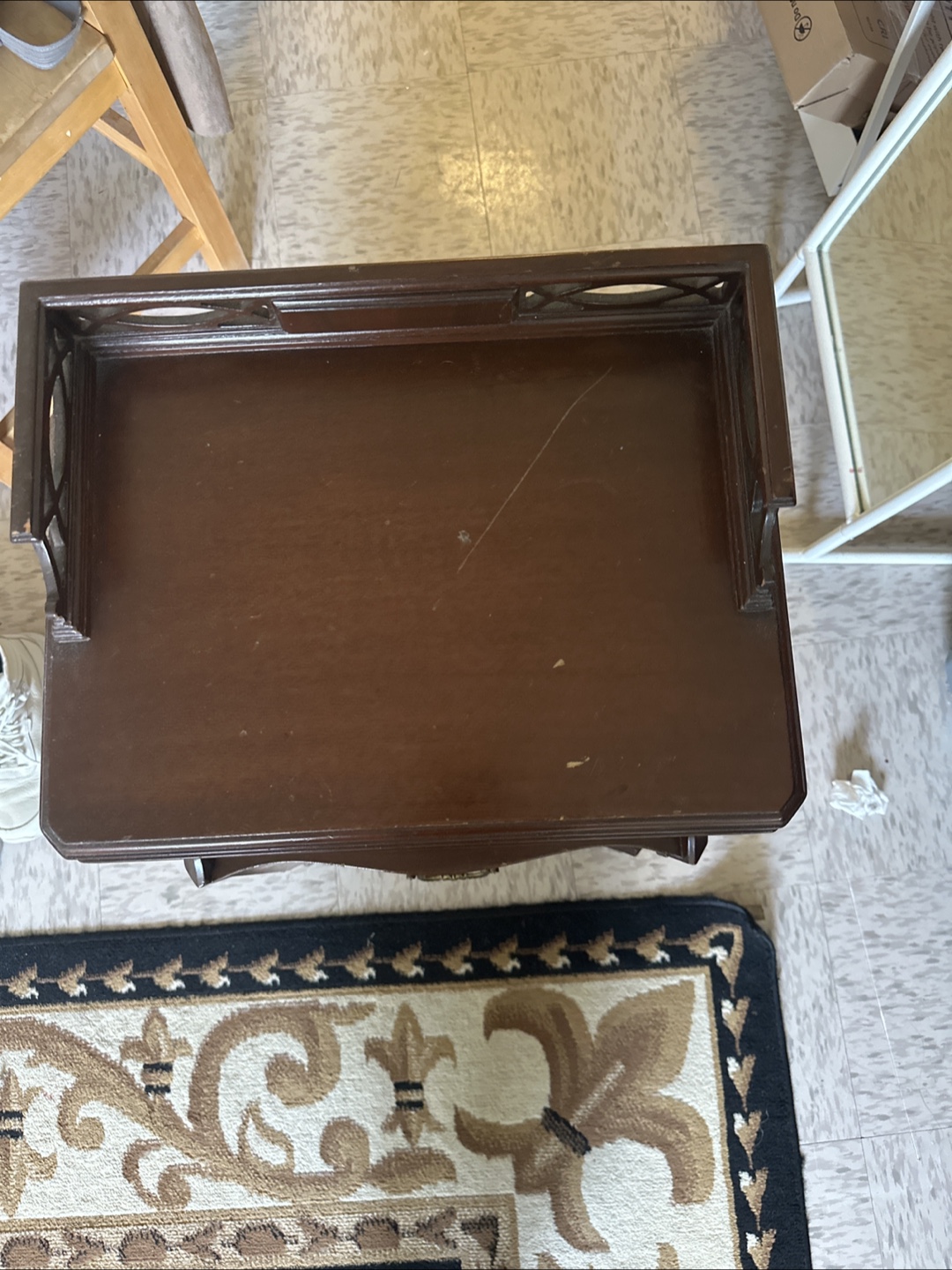 Dark brown wooden end table. Features a single drawer and open shelf. Intricate detailing on the top and sides. Curved legs. Shows some wear.