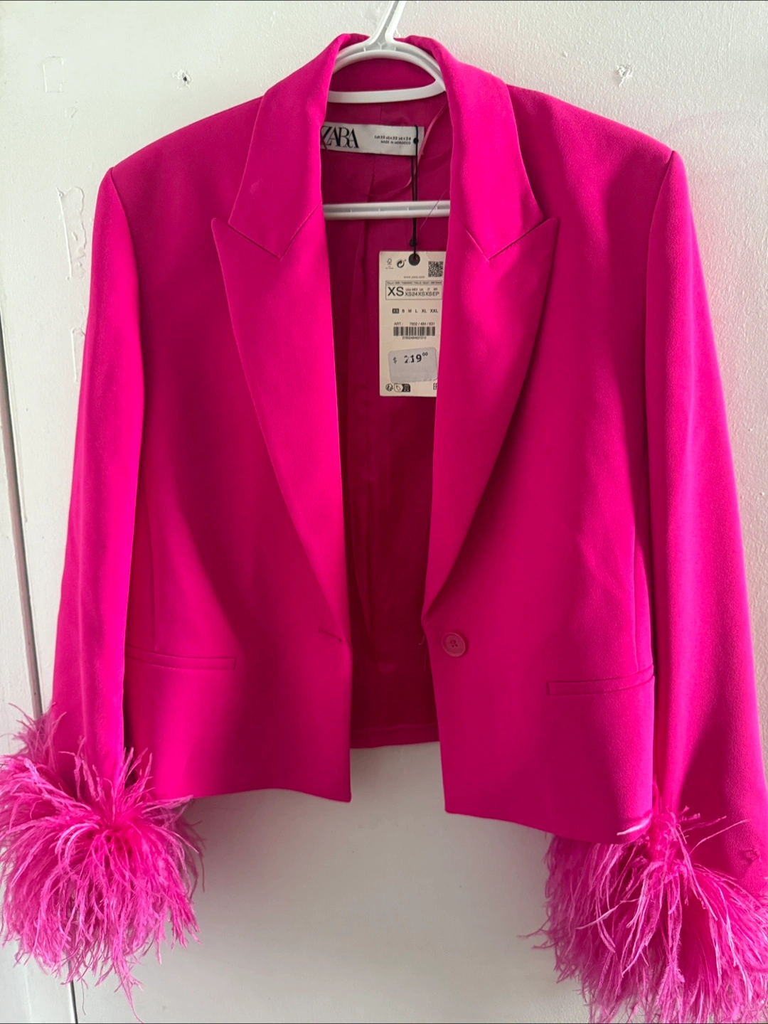 Selling a Zara blazer in a vibrant pink colour! It features fun feather cuffs and is a size XS. Originally bought for $219