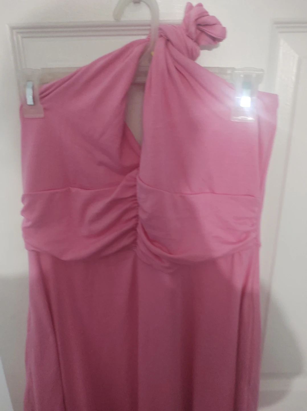 This is a pretty pink halter neck dress with a ruched bust detail. It's a comfortable and stylish piece for various occasions. The fabric appears to be a soft jersey material.