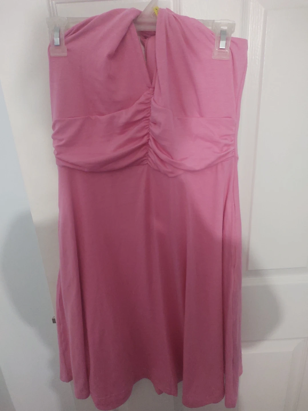 This is a pretty pink halter neck dress with a ruched bust detail. It's a comfortable and stylish piece for various occasions. The fabric appears to be a soft jersey material.
