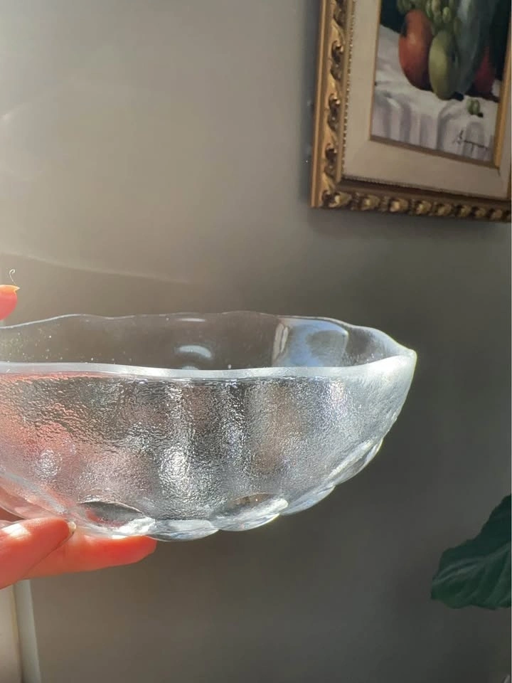 A stunning piece of Finnish design history. This is an authentic Iittala "Gaissa" series set, designed by the legendary Tapio Wirkkala. The Design: Famous "Ice Age" / "Glacier" textured base with beautifully organic, wavy rims. Not perfectly circular, capturing the raw beauty of melting ice. Quality: Heavy, premium lead-free crystal with incredible clarity and light refraction. Condition: Mint Condition. No chips, cracks, or clouding. Includes: 1 Large Serving Bowl + 3 Individual Bowls. Collector's Note: Perfect for MCM (Mid-Century Modern) lovers and Scandinavian glass collectors.