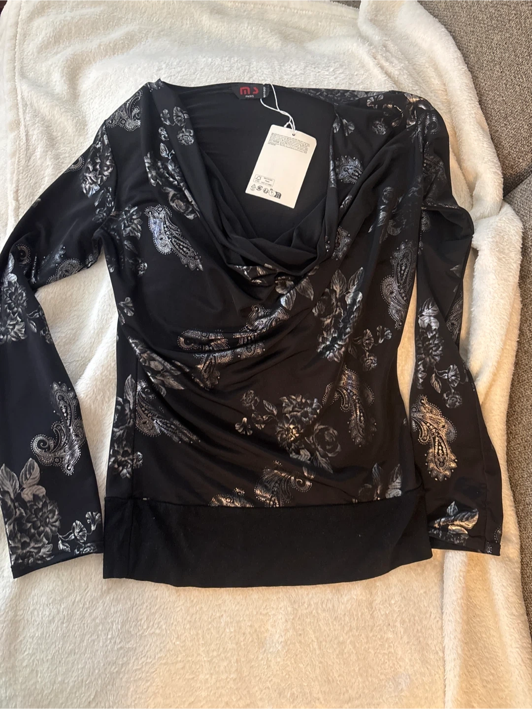 This is a beautiful black long sleeve top from MS Paris. It features a lovely floral pattern and is made with 20% recycled cotton. It's a size small and in excellent condition!