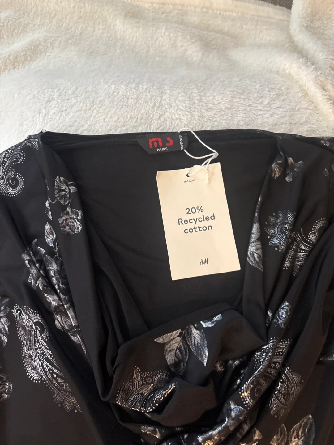 This is a beautiful black long sleeve top from MS Paris. It features a lovely floral pattern and is made with 20% recycled cotton. It's a size small and in excellent condition!