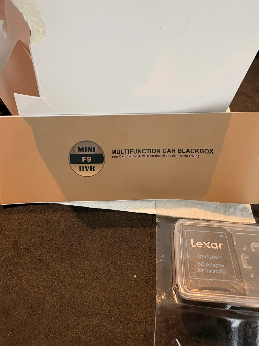 This MINI F9 DVR multifunction car blackbox records all situations while driving. It's a portable camera with various mounts and a USB charging cable. An SD card adapter is included.