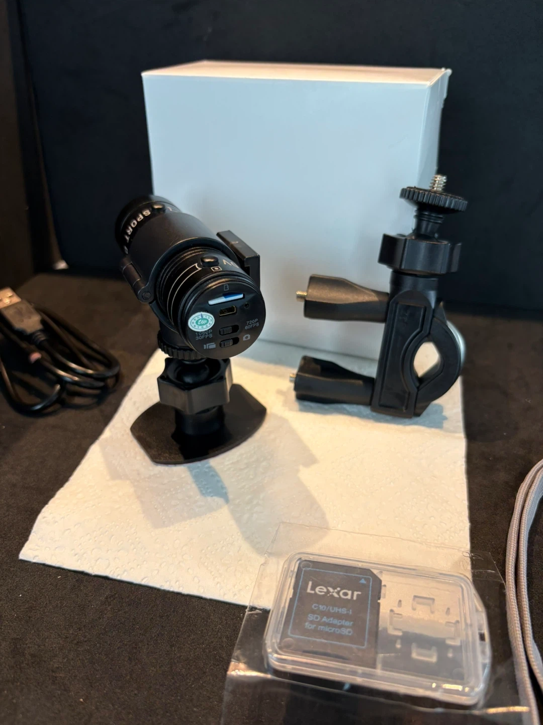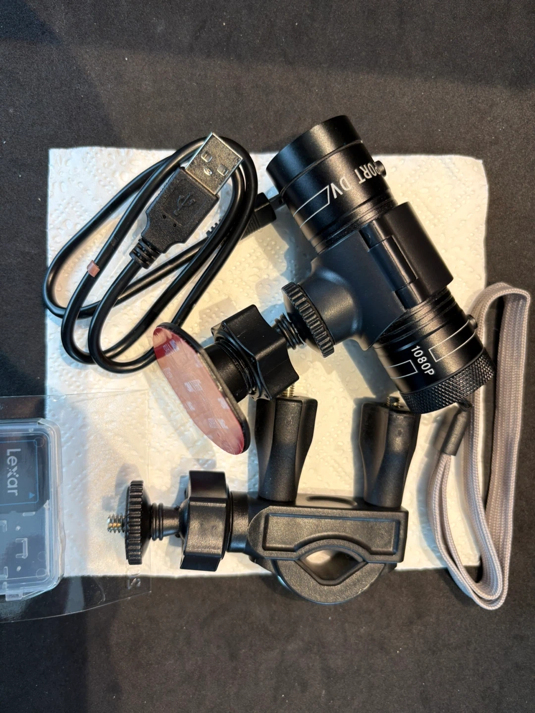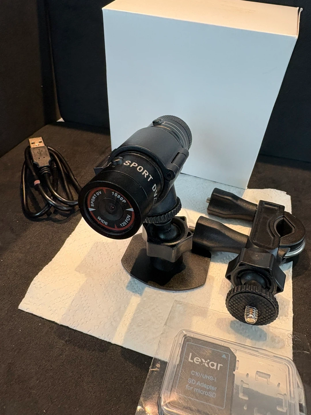 This MINI F9 DVR multifunction car blackbox records all situations while driving. It's a portable camera with various mounts and a USB charging cable. An SD card adapter is included.