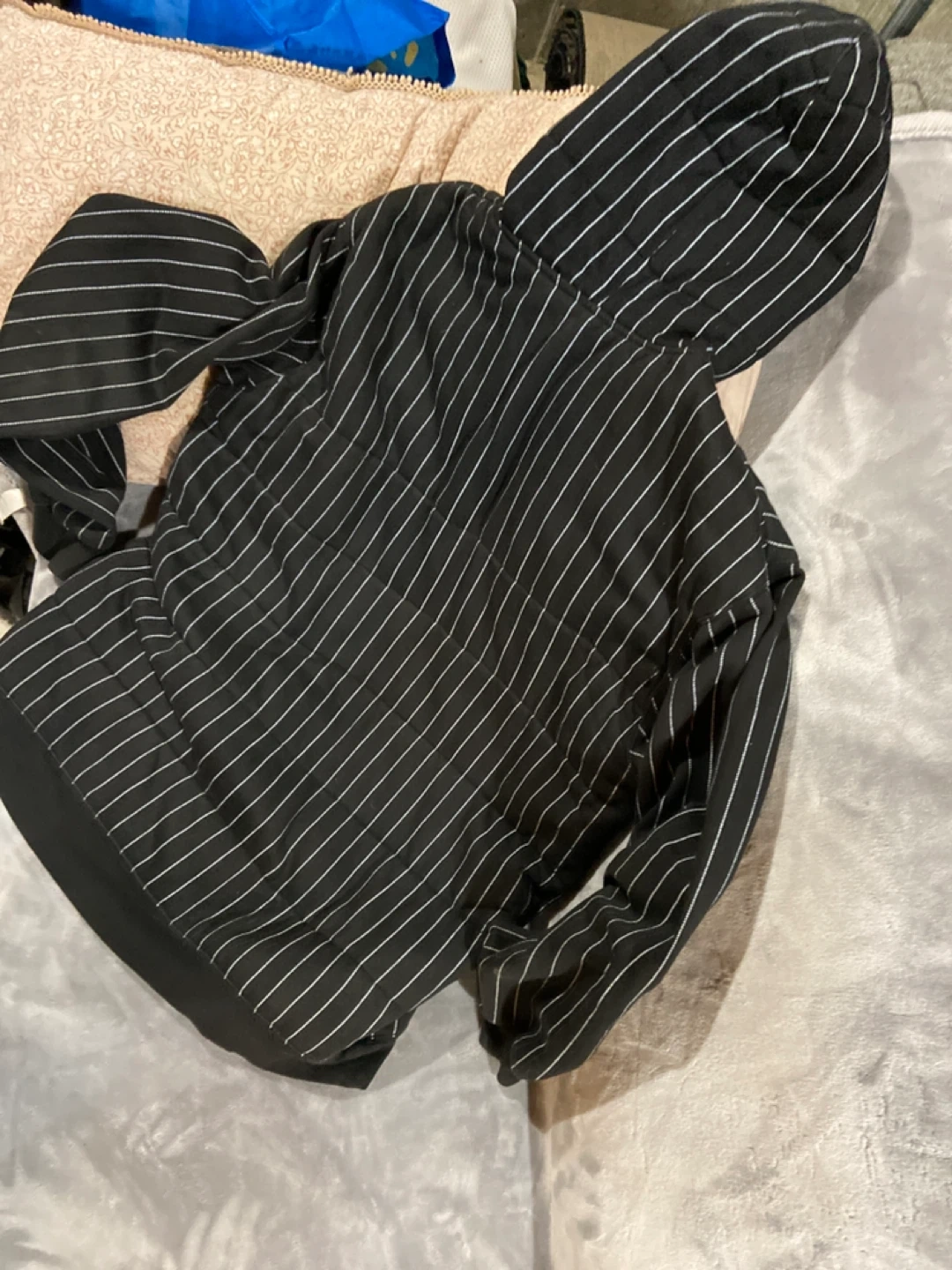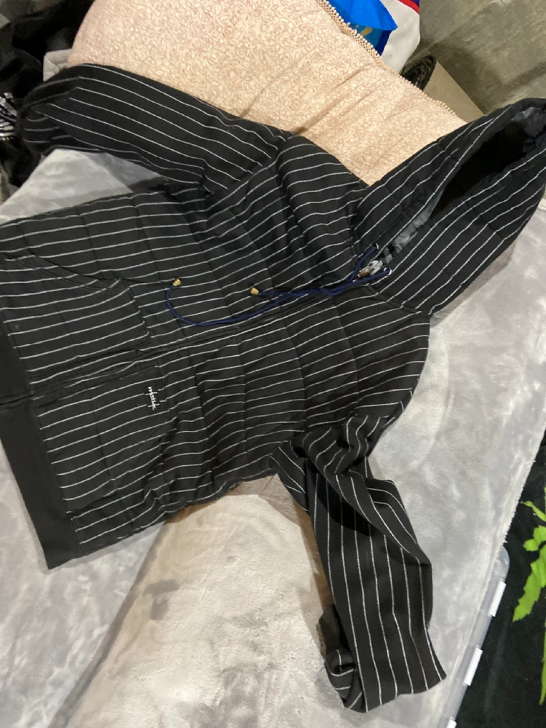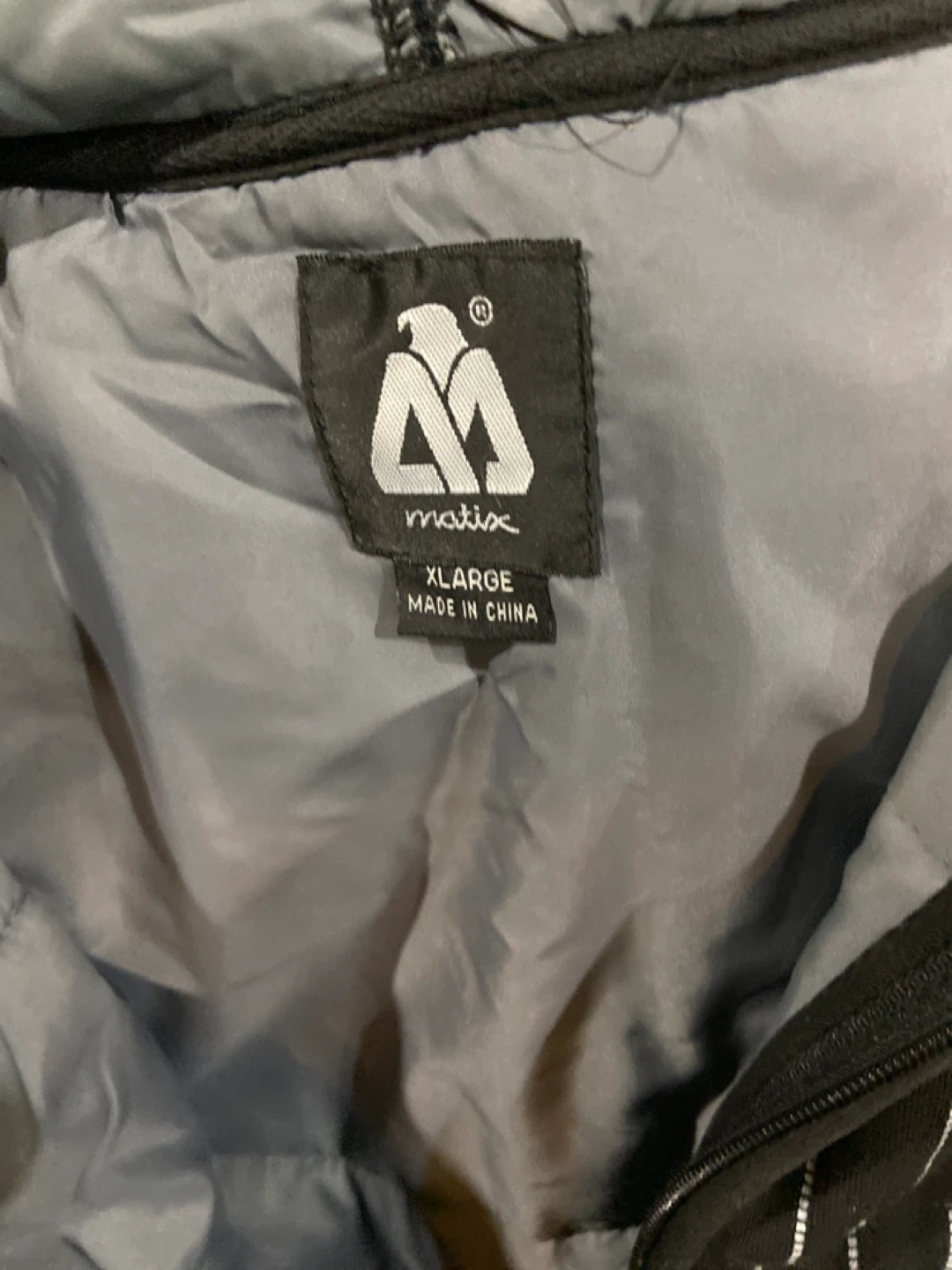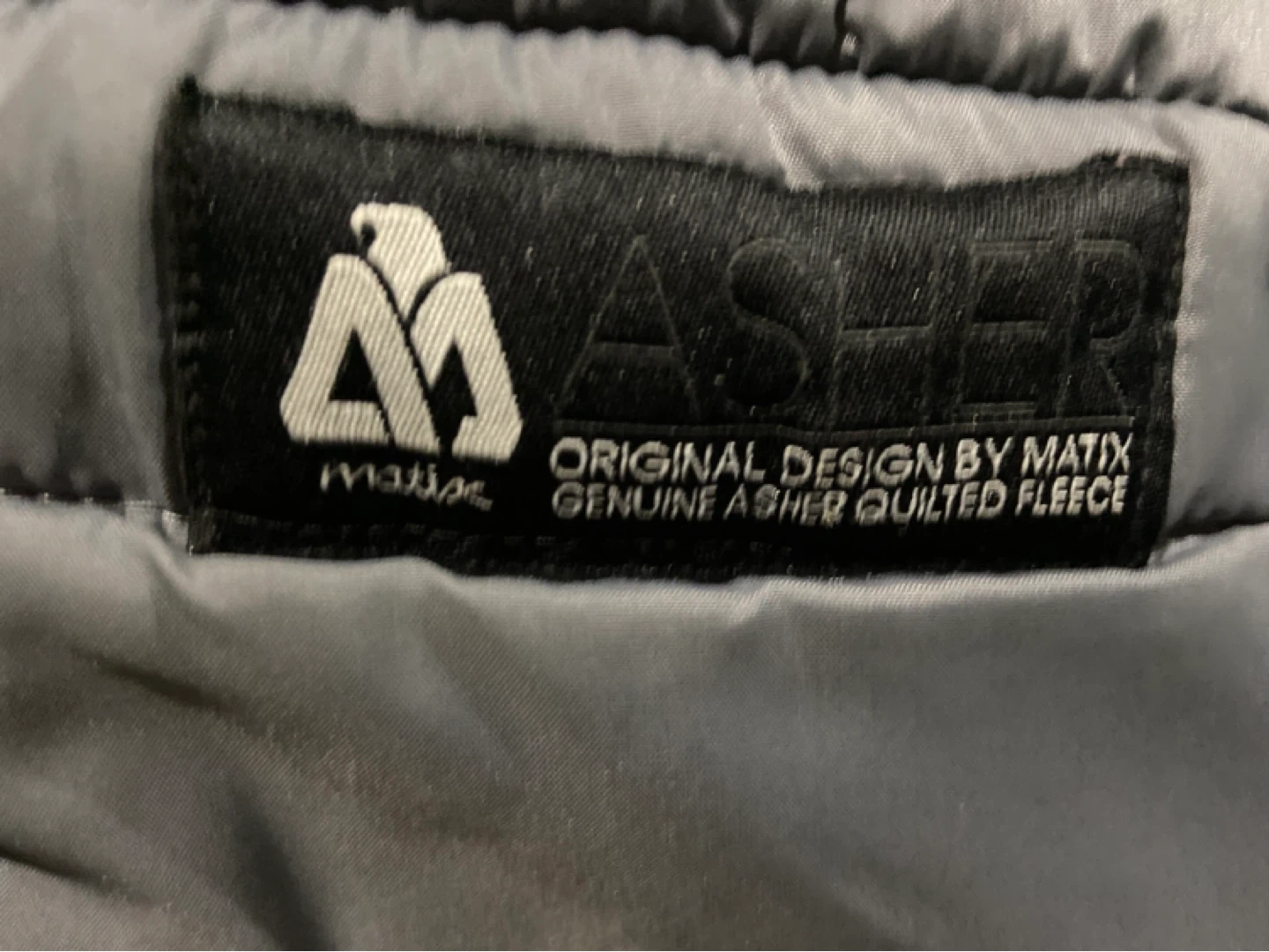 This is a Matix Asher quilted fleece hoodie. It's black with white pinstripes. Size XL is visible on the tag. Original design by Matix, genuine Asher quilted fleece. Aaking 30 obo basically new used 1 time