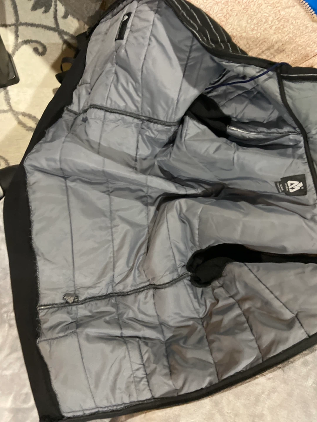 This is a Matix Asher quilted fleece hoodie. It's black with white pinstripes. Size XL is visible on the tag. Original design by Matix, genuine Asher quilted fleece. Aaking 30 obo basically new used 1 time