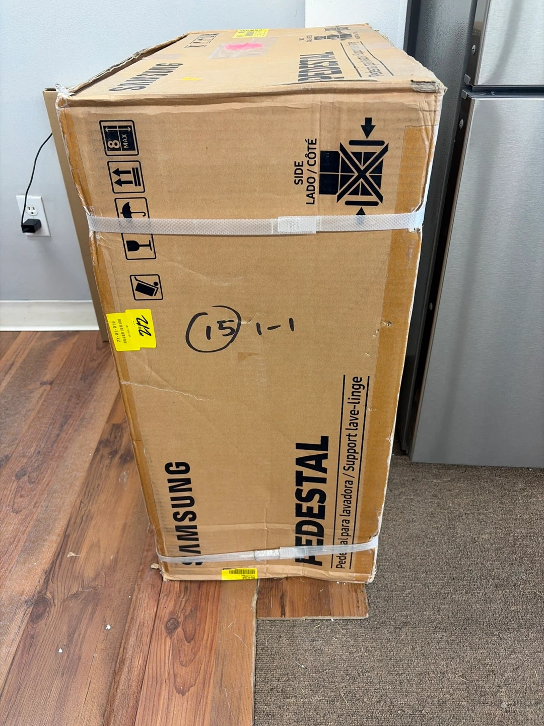 This is a new Samsung WE402NP Inox pedestal. It's assembled in the U.S.A. This pedestal provides extra storage and elevates your washer or dryer.
