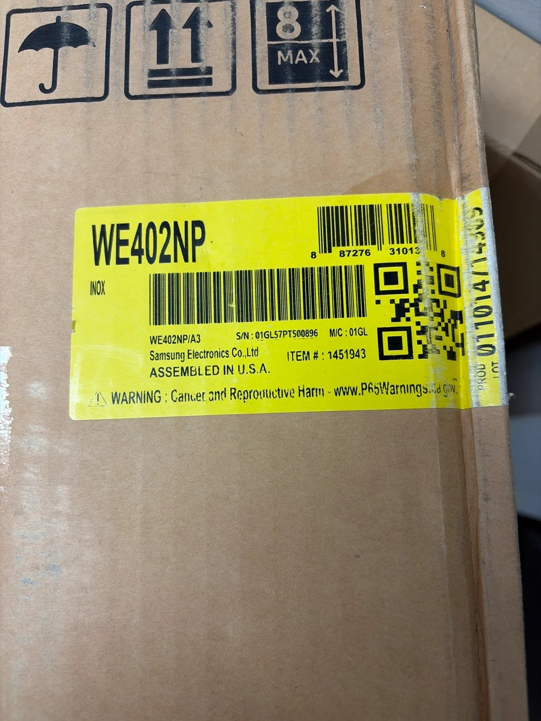 This is a new Samsung WE402NP Inox pedestal. It's assembled in the U.S.A. This pedestal provides extra storage and elevates your washer or dryer.