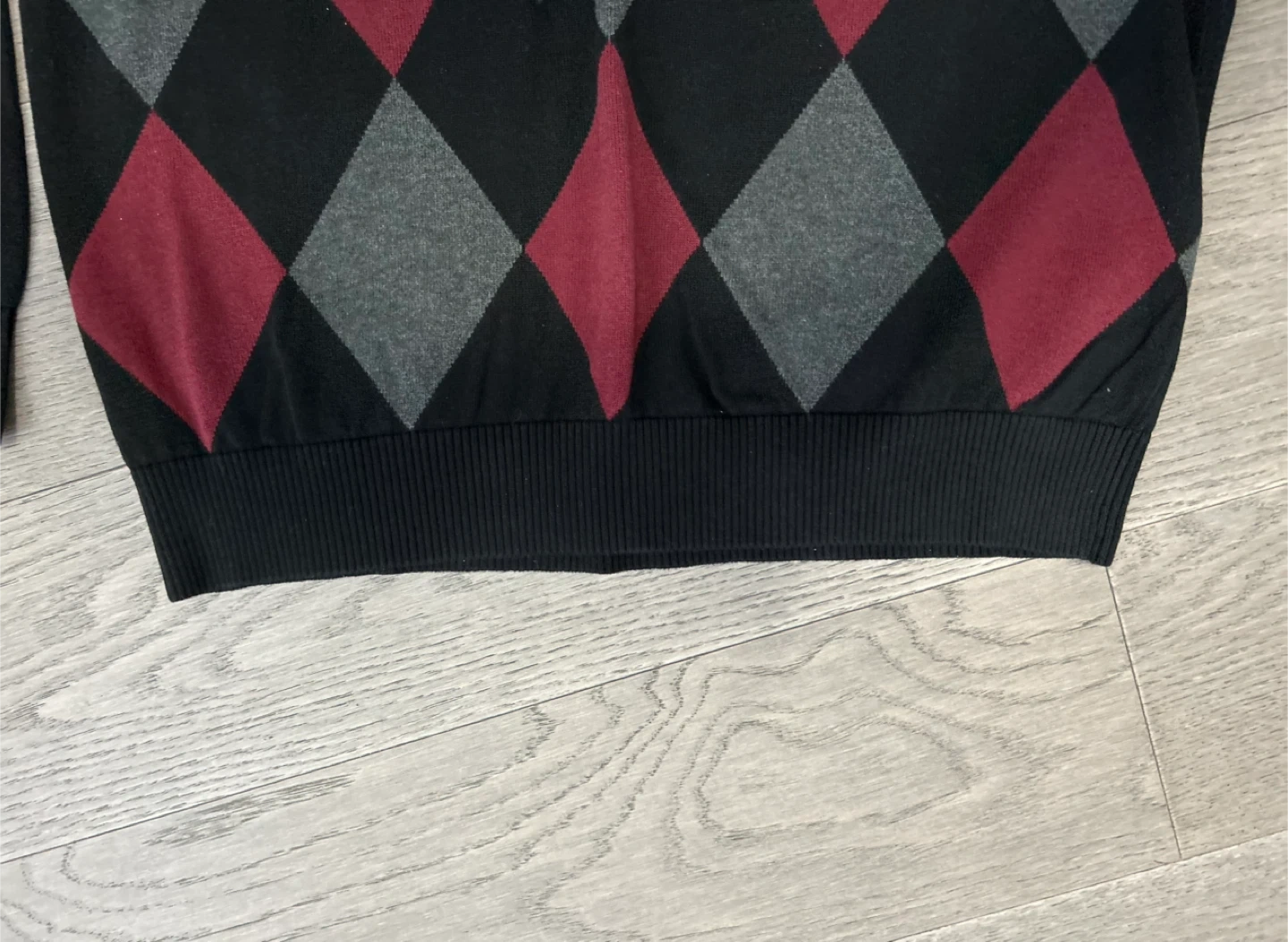 In great shape. 100% cotton. Features a classic argyle pattern in black, burgundy, and grey. Size large. Machine washable. Brampton, near Queen and Kennedy.