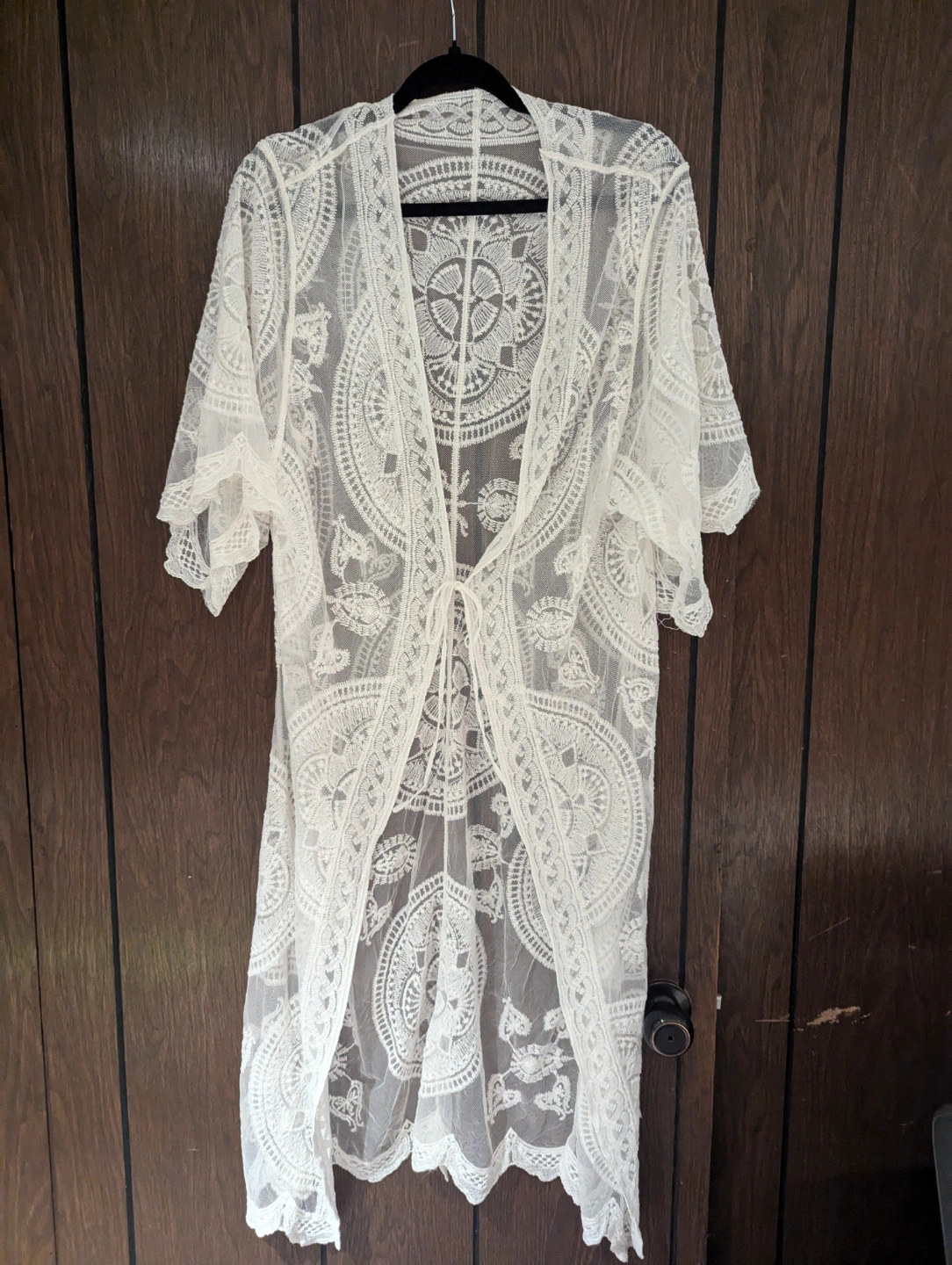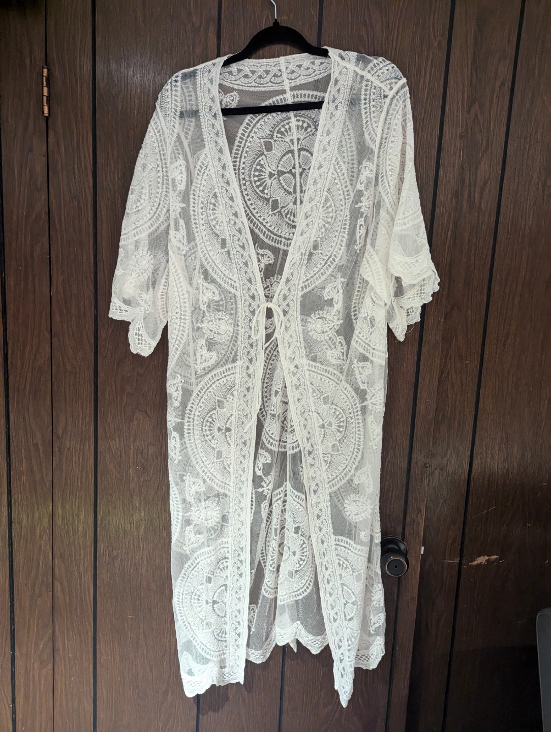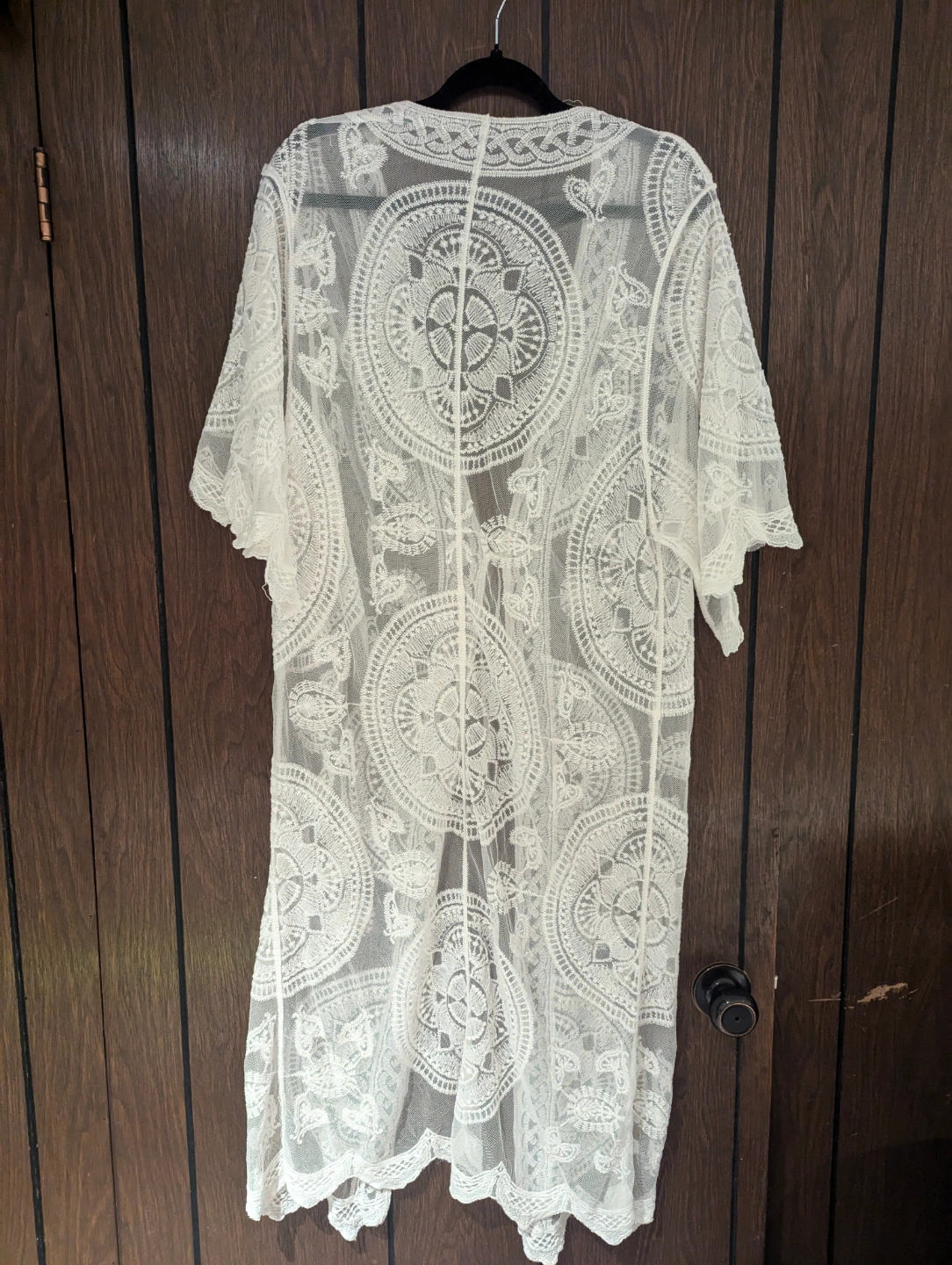 White lace cardigan. Features a V-neck, short sleeves, and an open front. Intricate mandala-style patterns throughout. Lightweight and flowy. Perfect for layering.