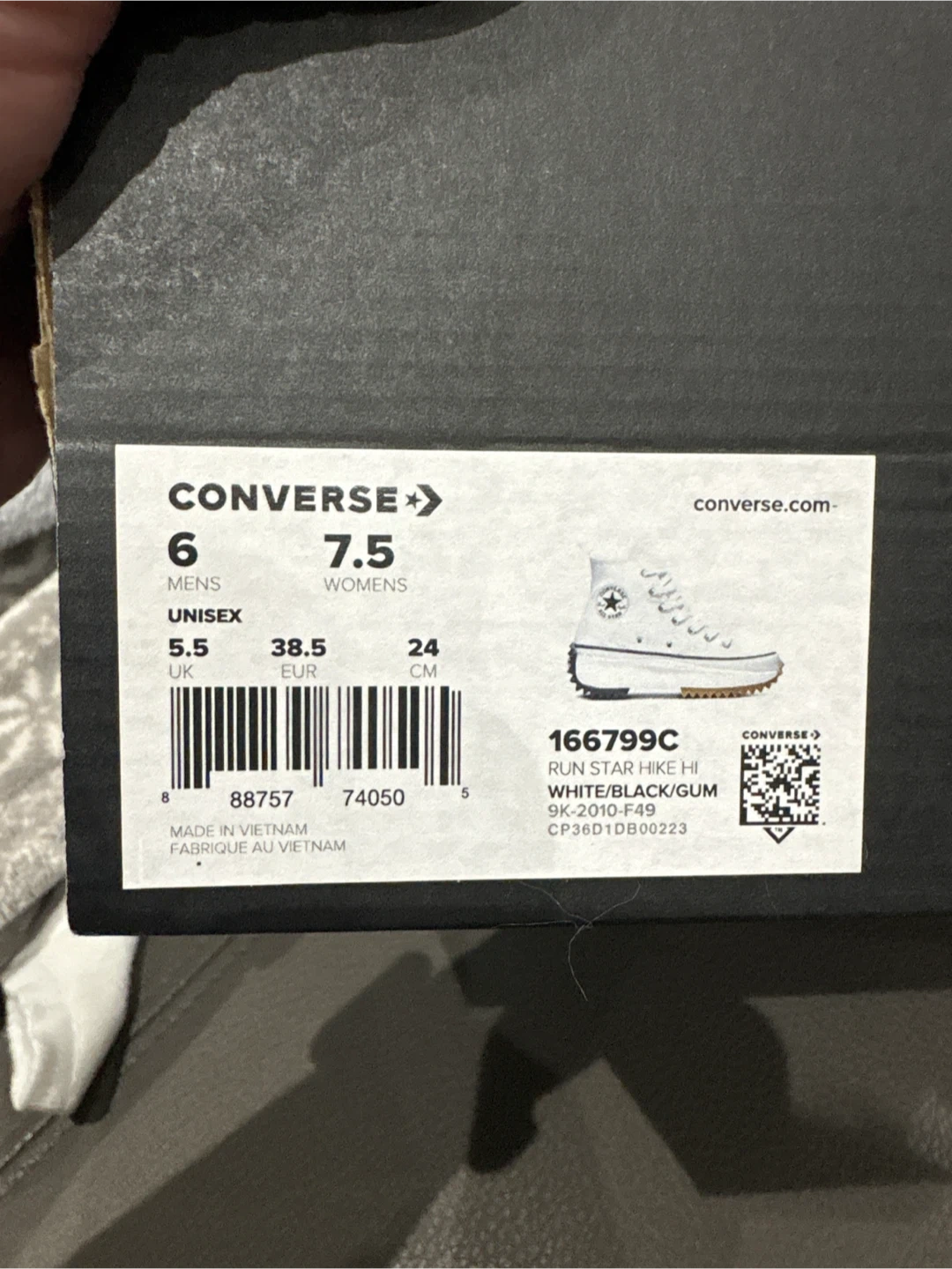Converse Run Star Hike Hi sneakers in white, black, and gum. These high-top canvas shoes have a platform sole and a rugged outsole. UNISEX MENS SIZE 6 WOMENS SIZE 7.5