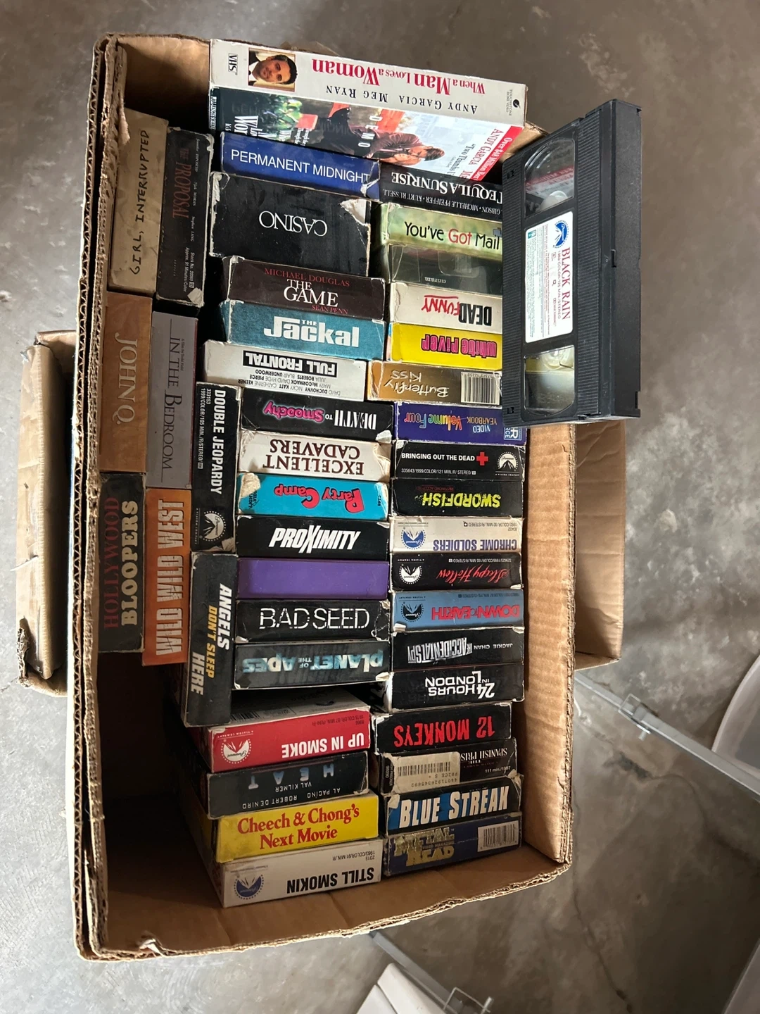 A collection of VHS movies including 'Black Rain', 'Casino', 'The Jackal', 'Full Frontal', and many more titles. Includes various genres and actors. All tapes are in their original cases. Some cases may show signs of wear. Perfect for retro movie collectors! 45 in the box asking $1-$5 per movie some are rare and collectable