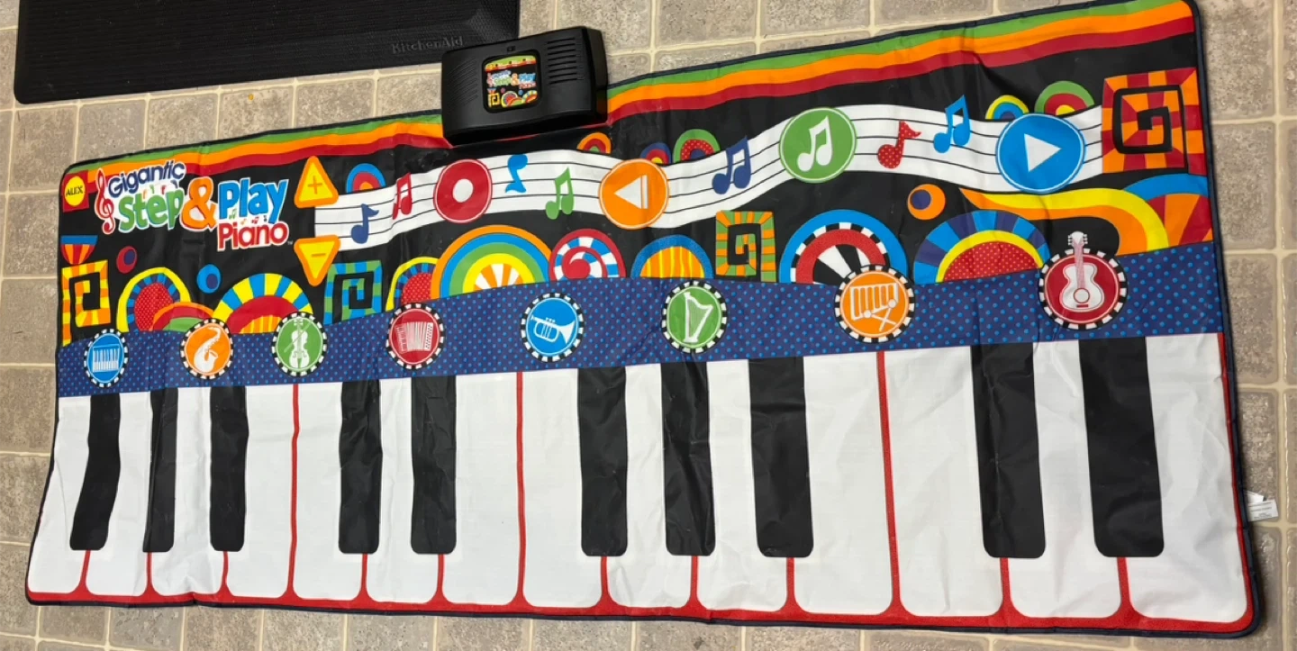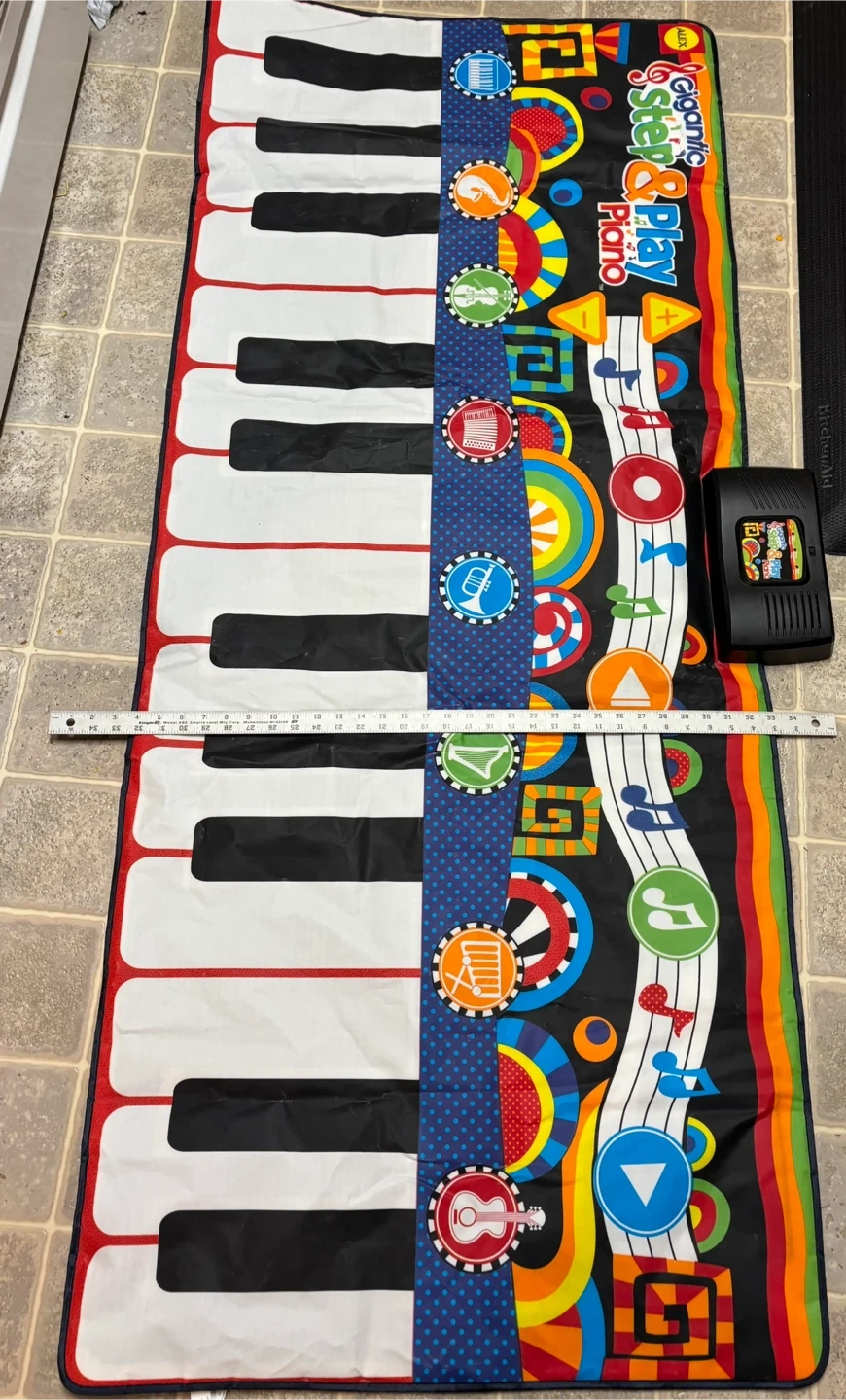 Get this Gigantic Step & Play Piano mat for hours of musical fun! It's a large interactive play mat with a piano keyboard that lights up and plays sounds when stepped on. The control box allows for different modes and sound options.