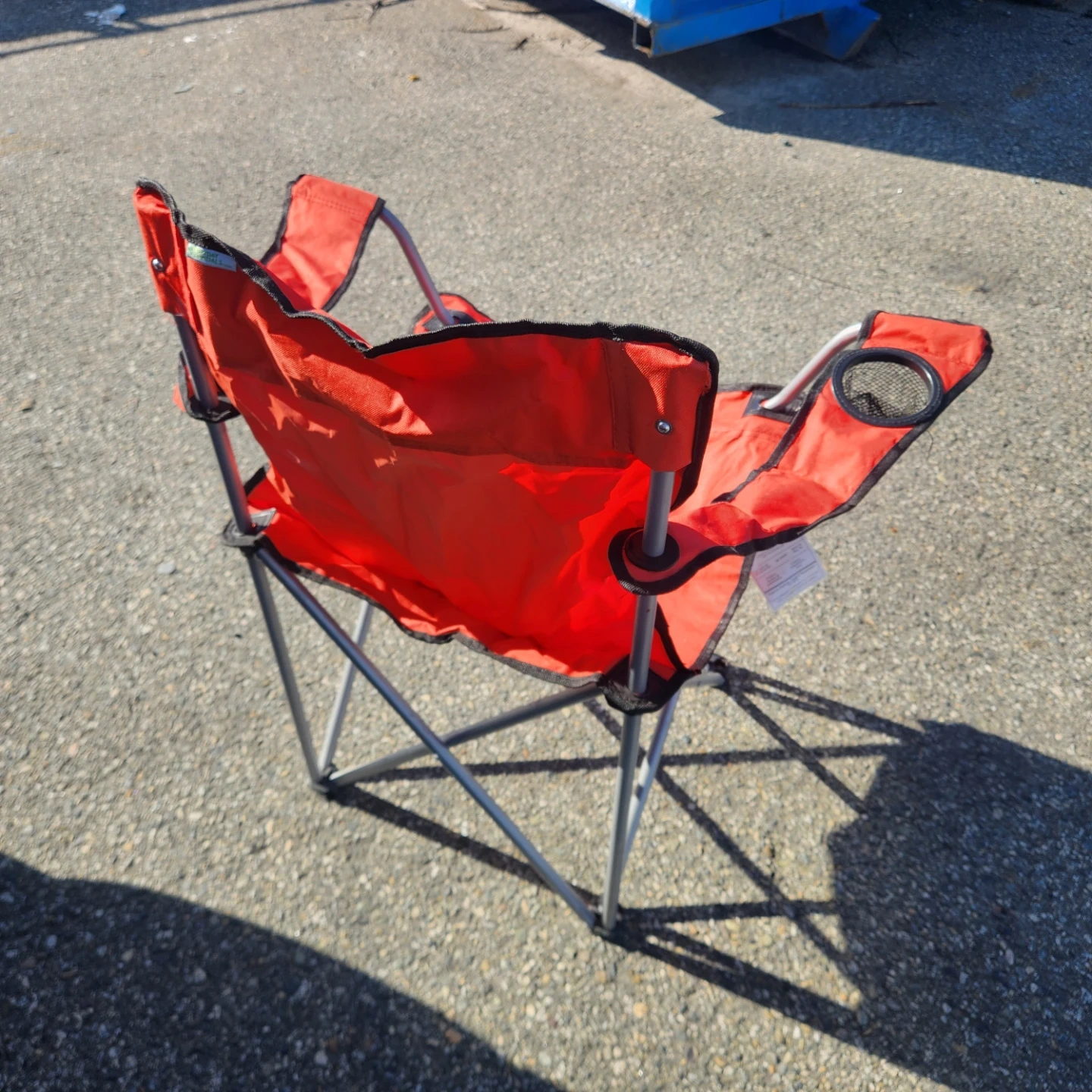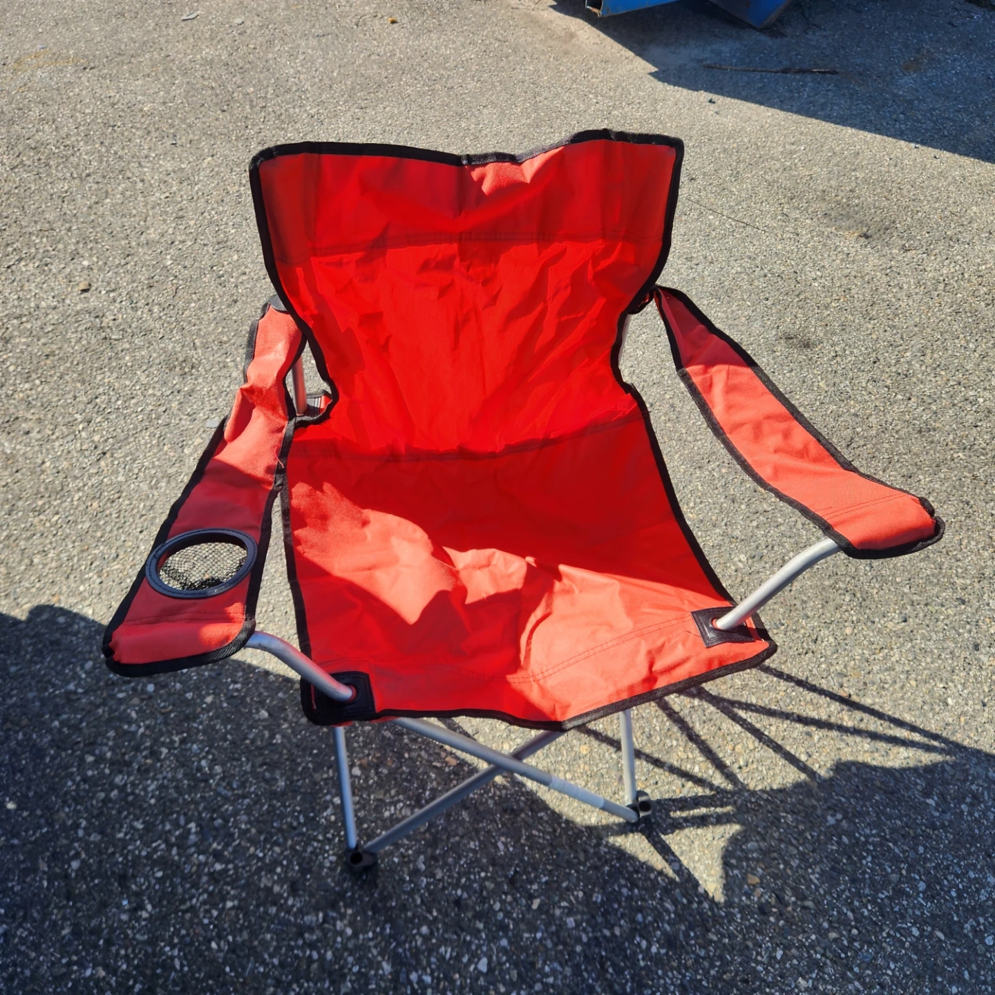 This is a red folding camp chair. It's made of fabric and has a metal frame. It includes a cup holder on one arm. Comes with a blue carrying bag.