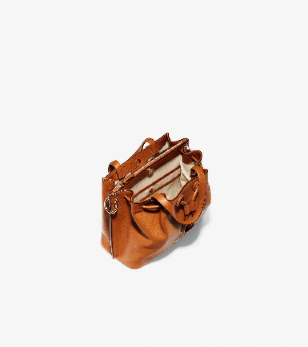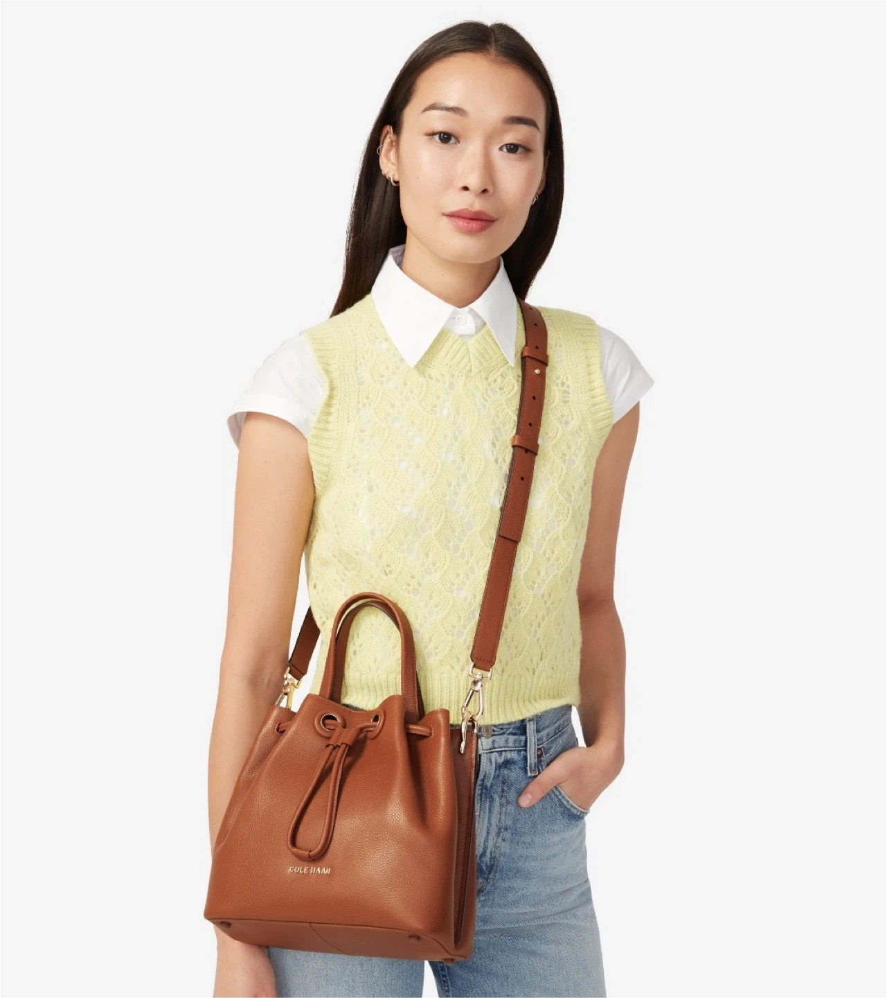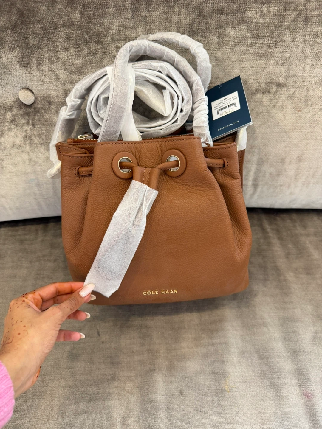 This is a brown leather bucket bag from Cole Haan. It's in excellent condition and still has its original tags attached. This bag is perfect for everyday use and can carry your essentials.
