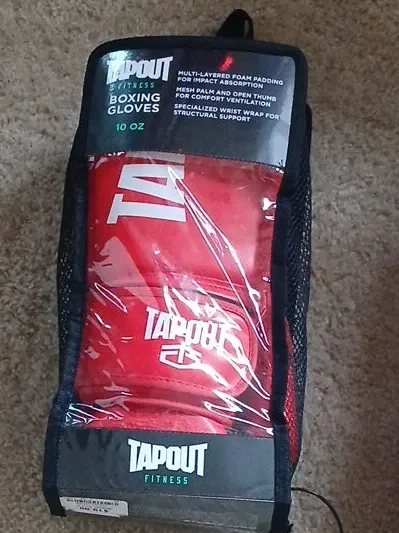 Tapout Fitness boxing gloves in red. These 10 oz gloves feature multi-layered foam padding for impact absorption. They have a mesh palm and open thumb for ventilation and a specialized wrist wrap for support.