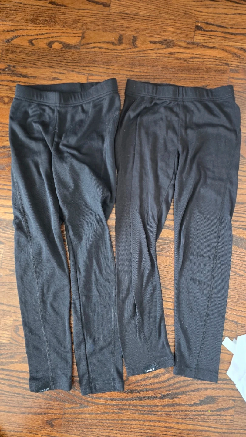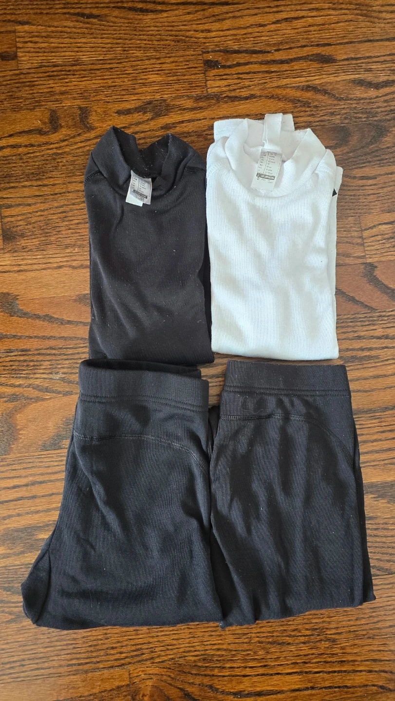 This set of 4 Decathlon thermal underwear includes two long-sleeved tops (black and white) and 2 pairs of black leggings.