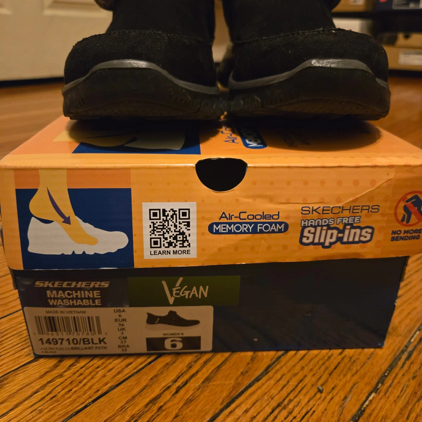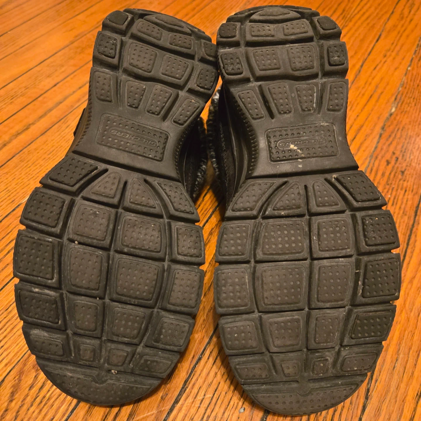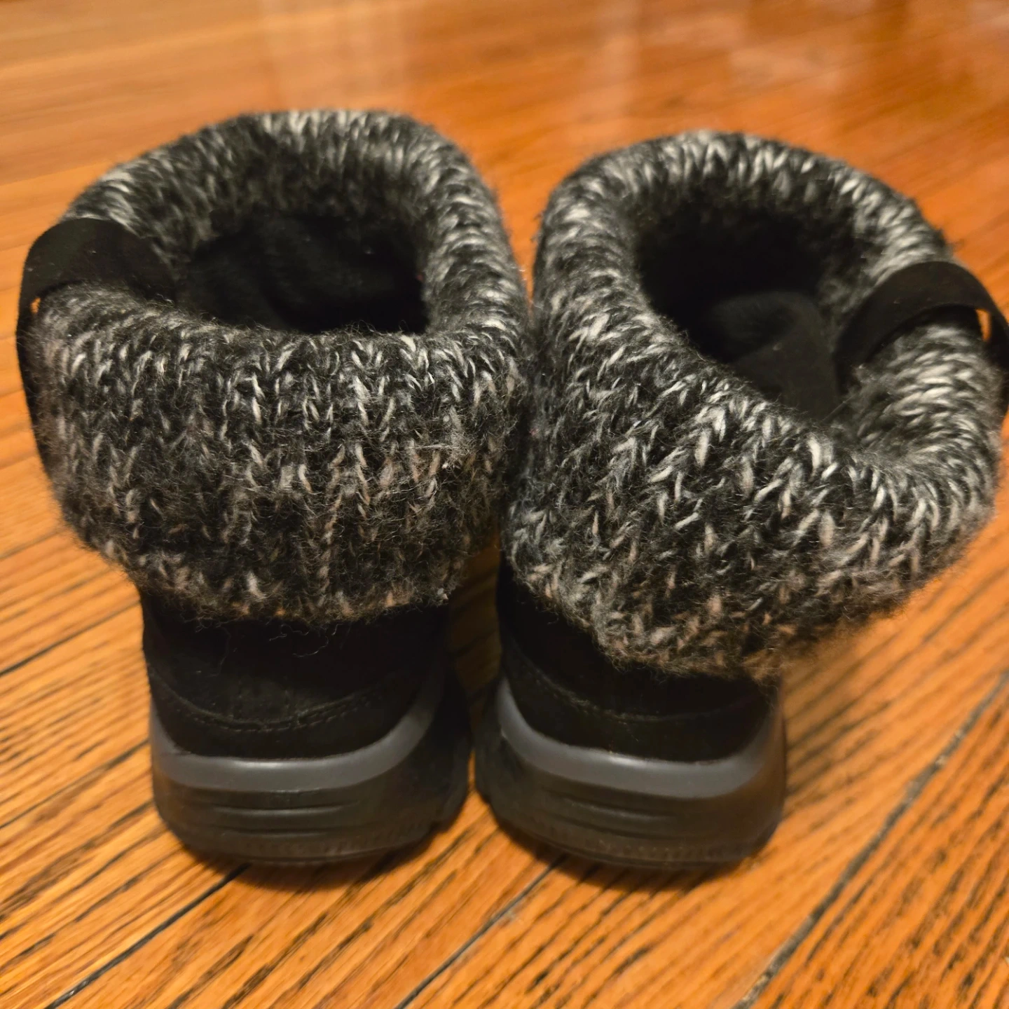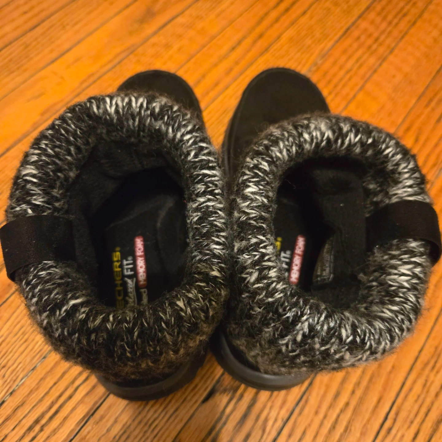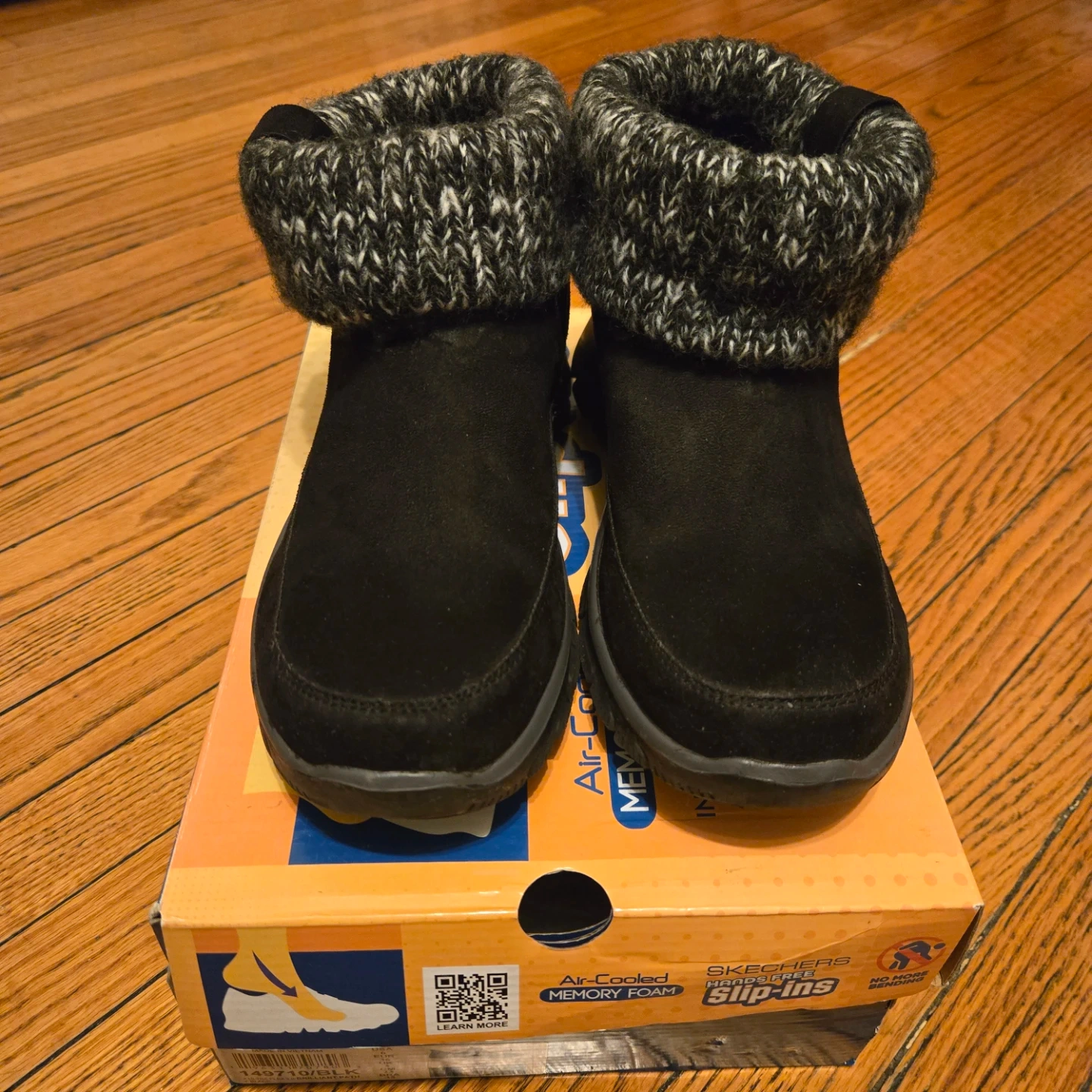 Comfy black suede booties with a cozy knit cuff. These Skechers boots feature a memory foam insole for extra comfort. The soles provide good grip for chilly days. Perfect for keeping your feet warm and stylish!