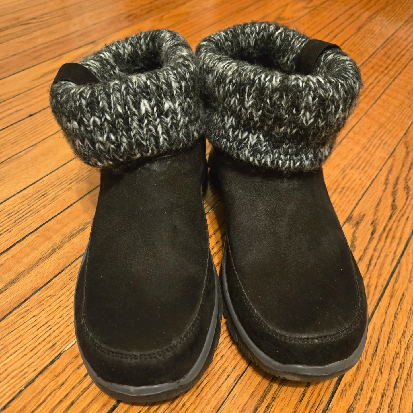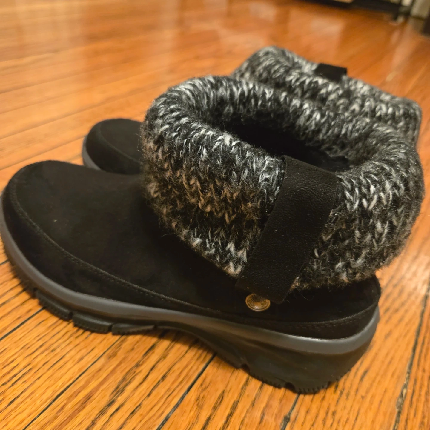 Comfy black suede booties with a cozy knit cuff. These Skechers boots feature a memory foam insole for extra comfort. The soles provide good grip for chilly days. Perfect for keeping your feet warm and stylish!