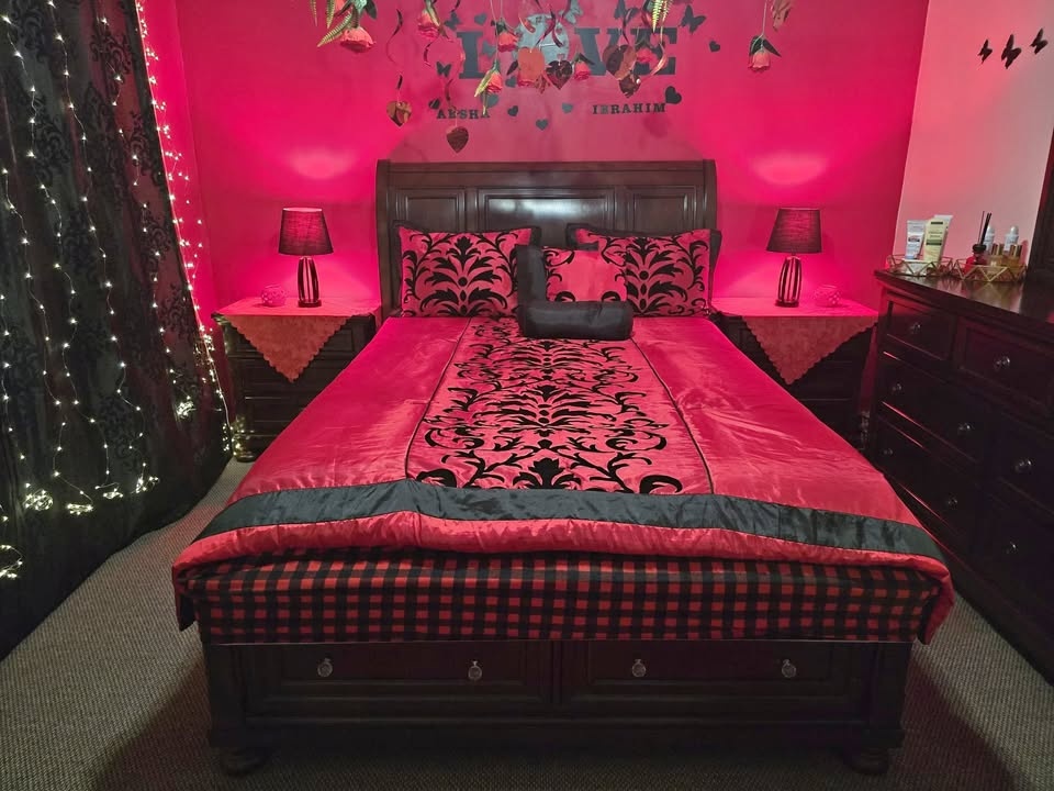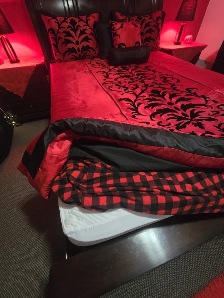 Complete bedroom set, everything you see is included. It's real wood with minor scratches. Moving out of the country, so selling it. Used lightly. Includes 2 nightstands with hidden drawers, a large dresser with 7 drawers and a mirror, a queen-sized bed with a new mattress and 2 drawers on the bottom. Also includes 2 lamps, blankets, and covers. Free red mat. Located at 108 Ave, 144 st.
