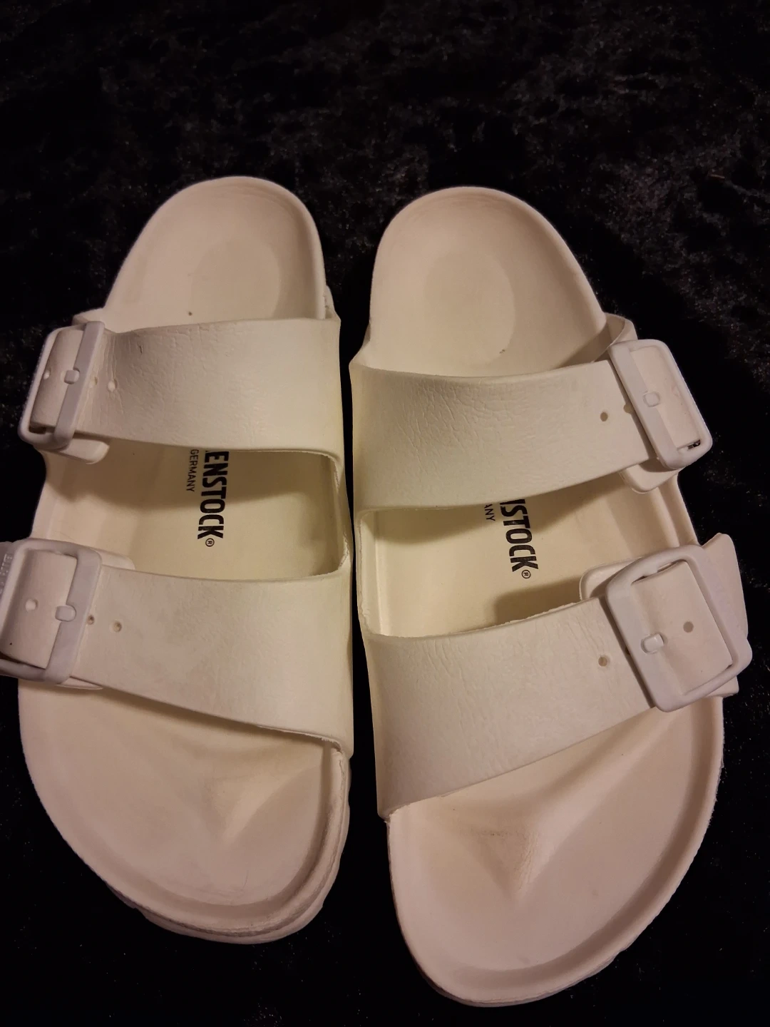 Selling a pair of Birkenstock Arizona sandals in white. They are a size 39, which is a US 8. They have some signs of wear on the soles, but are still in good condition!