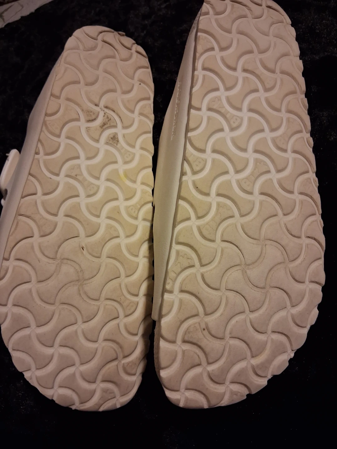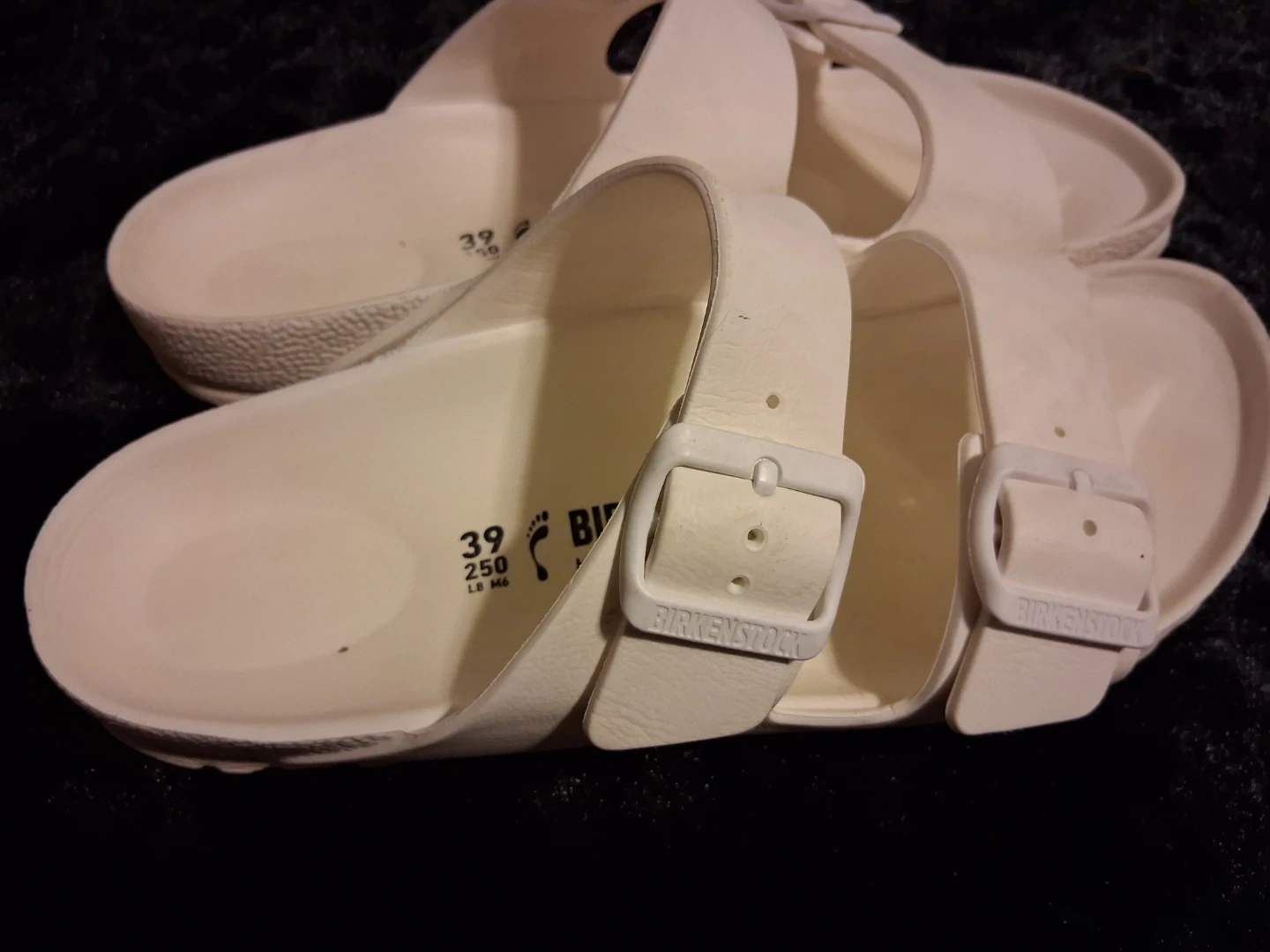 Selling a pair of Birkenstock Arizona sandals in white. They are a size 39, which is a US 8. They have some signs of wear on the soles, but are still in good condition!