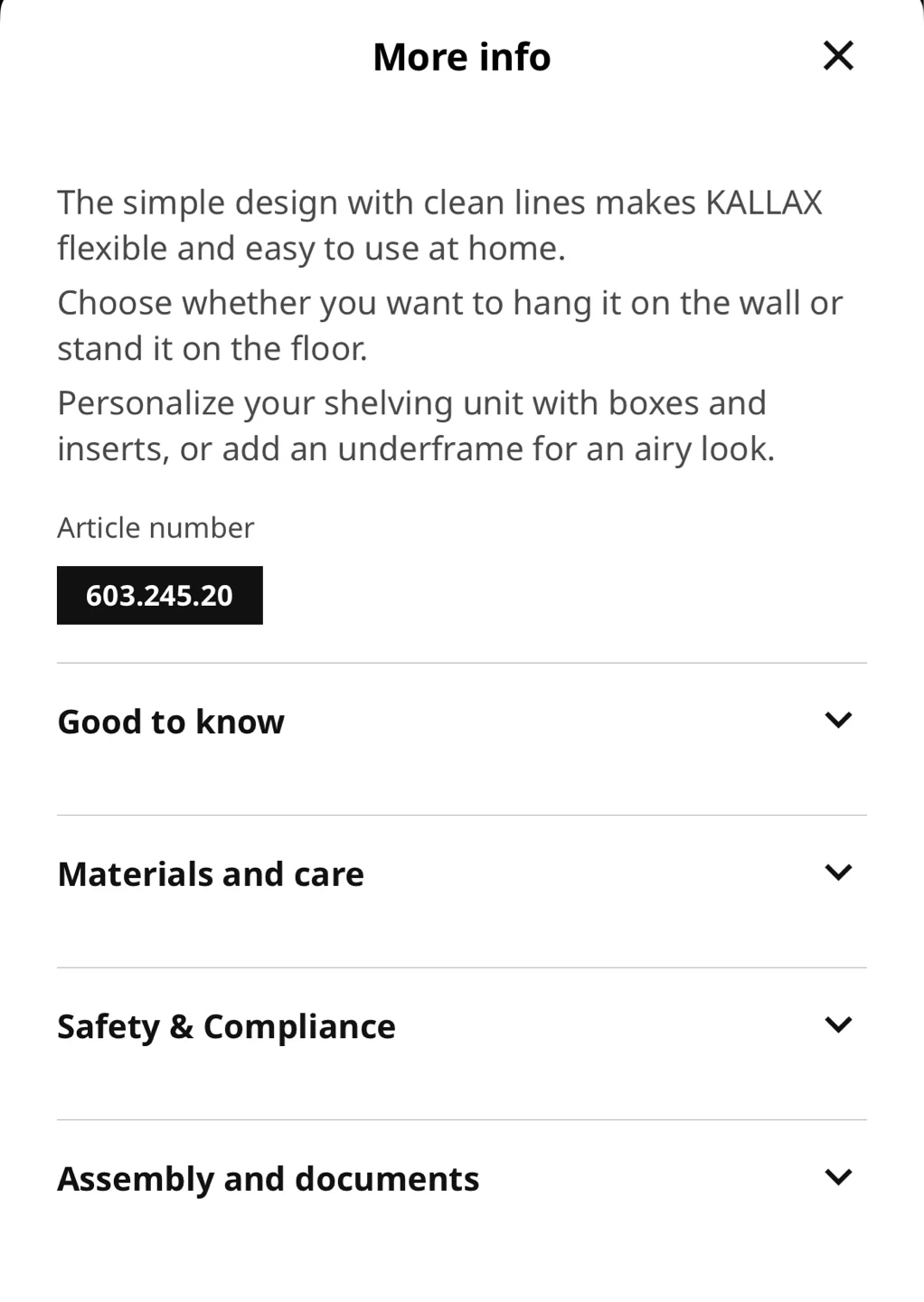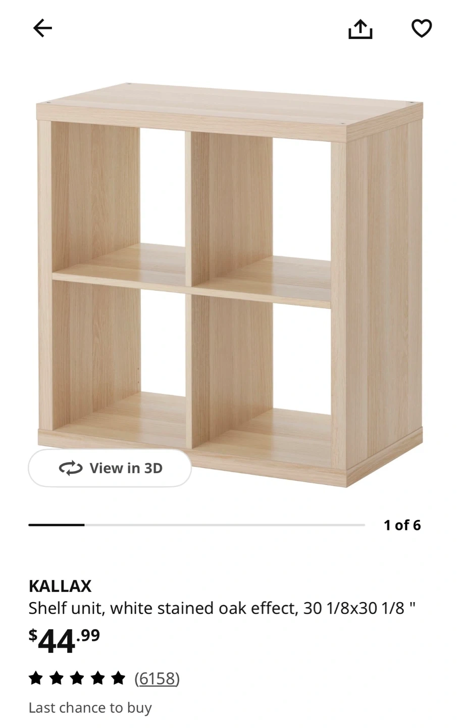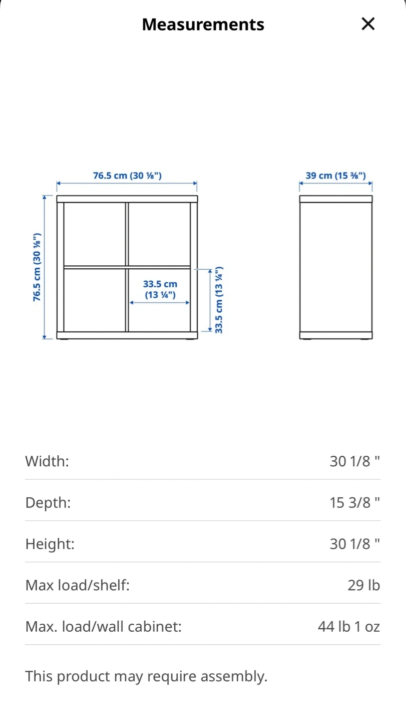 This IKEA KALLAX shelf unit is in a white stained oak effect finish. It measures 30 1/8" wide, 15 3/8" deep, and 30 1/8" high. It's a 4-cube configuration, perfect for storage and display!